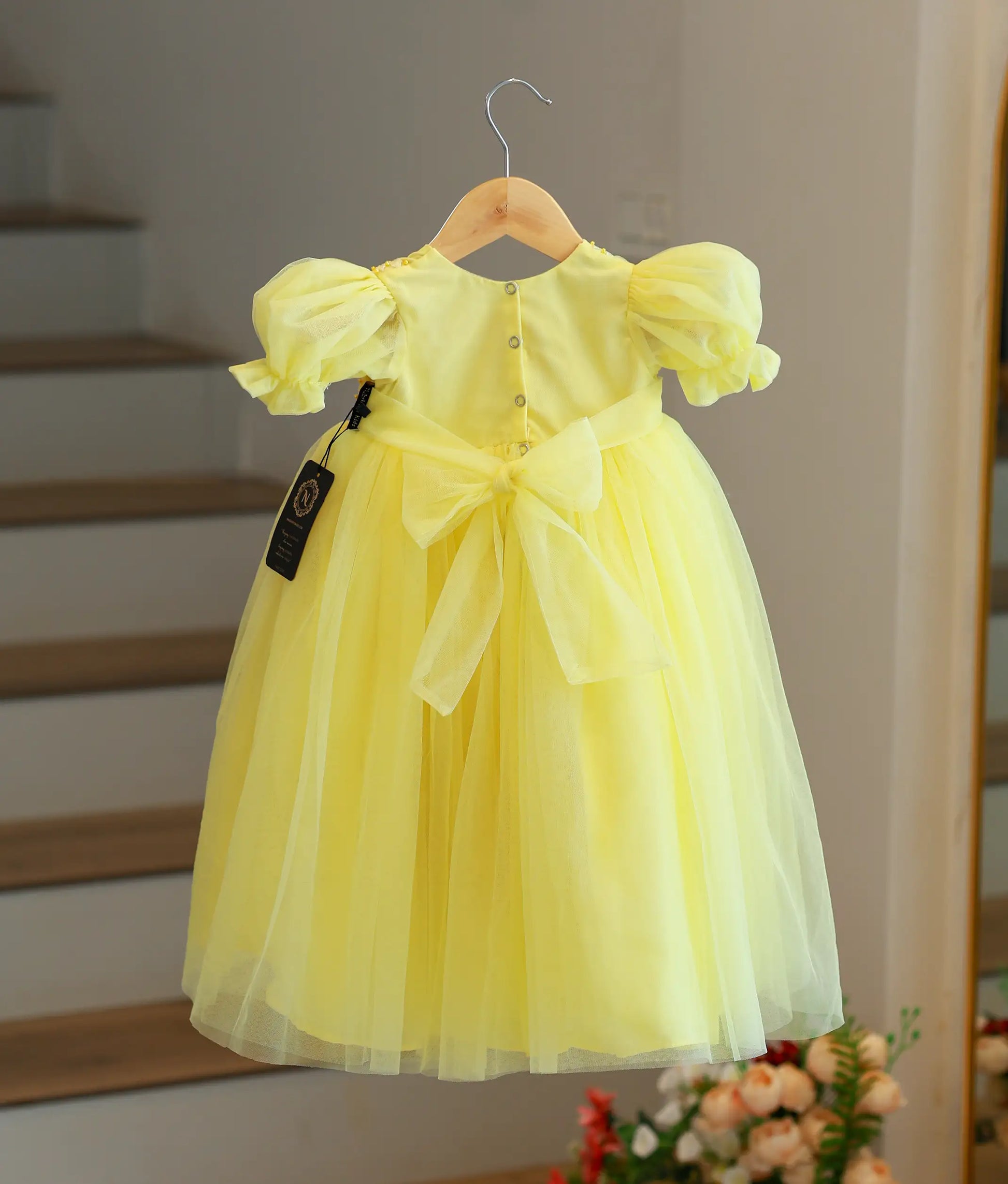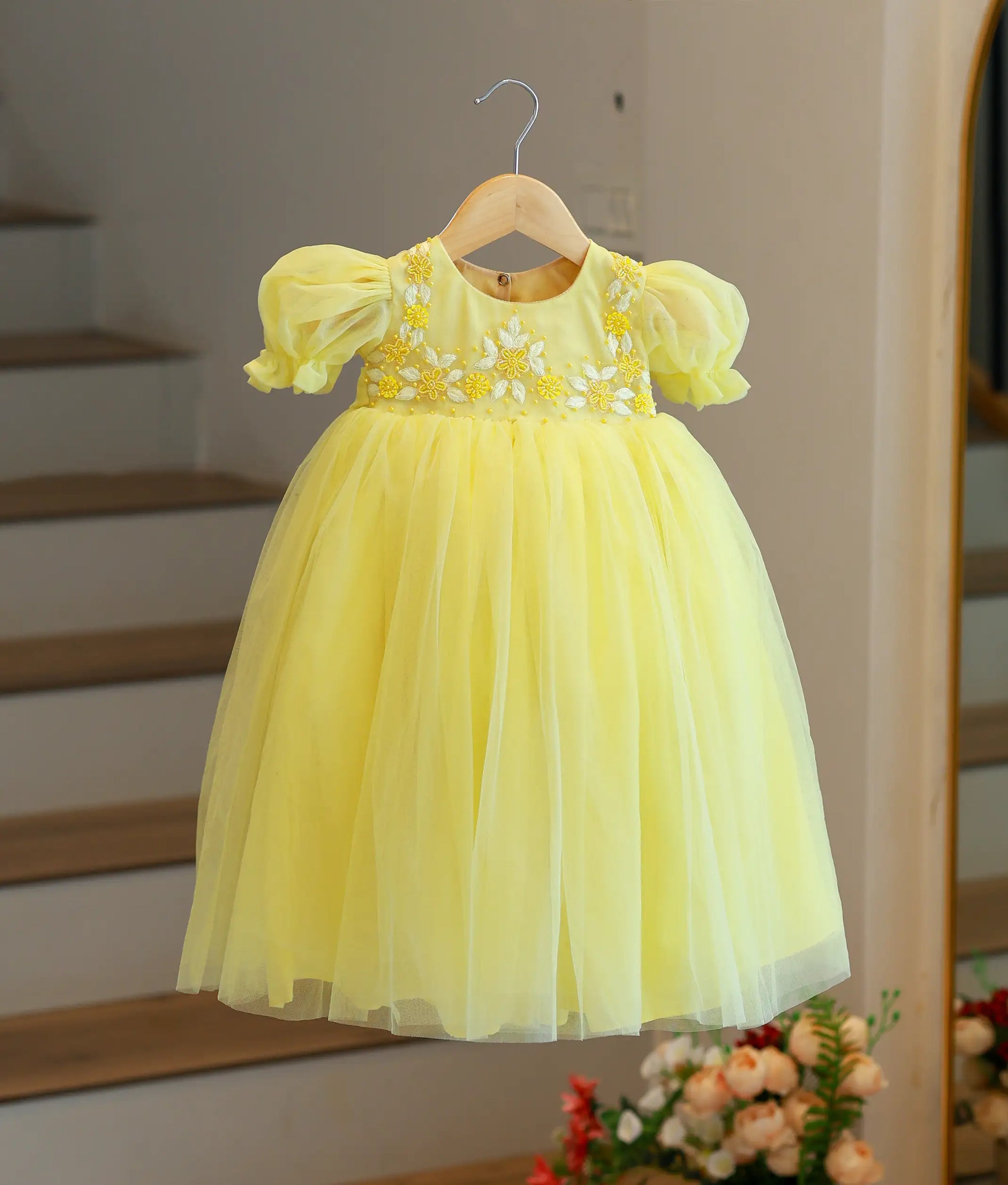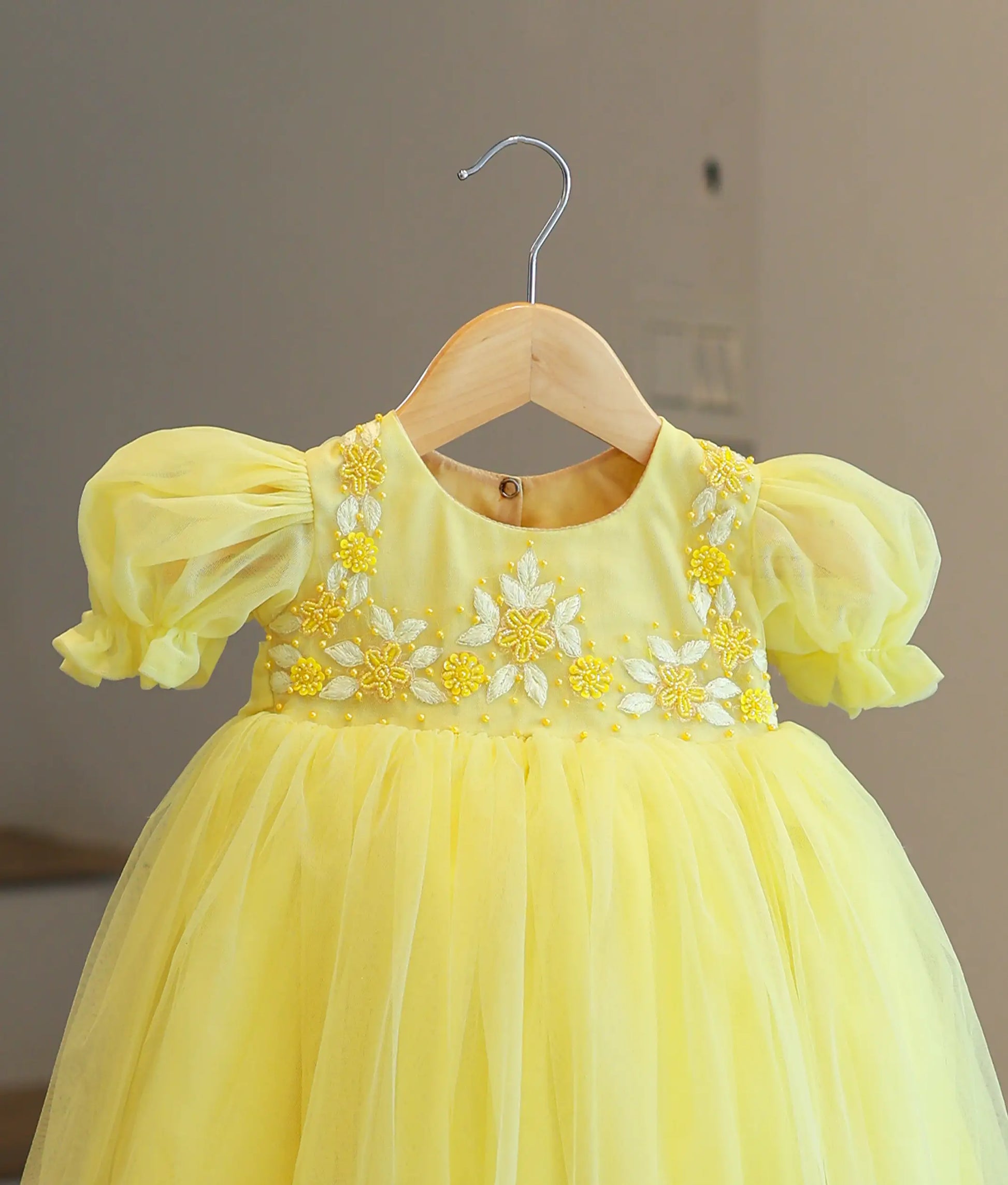Yellow Tulle Net Handworked Birthday Gown For Baby Girl [Ready To Ship: 7916]