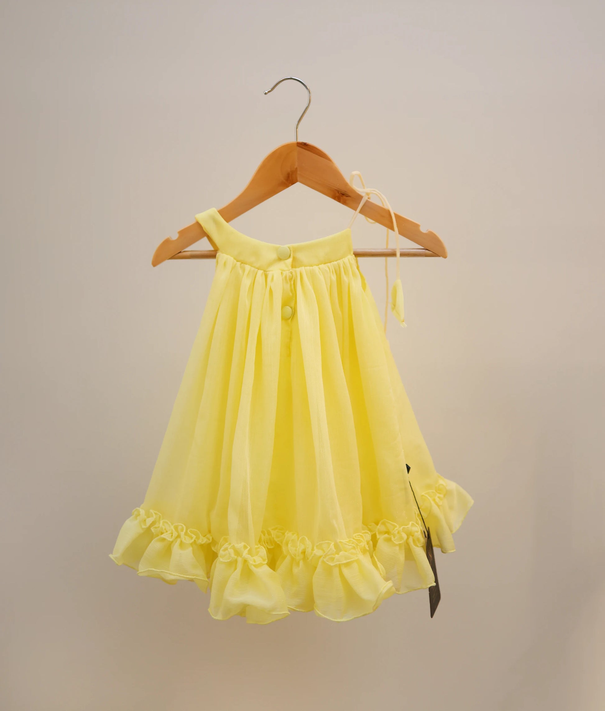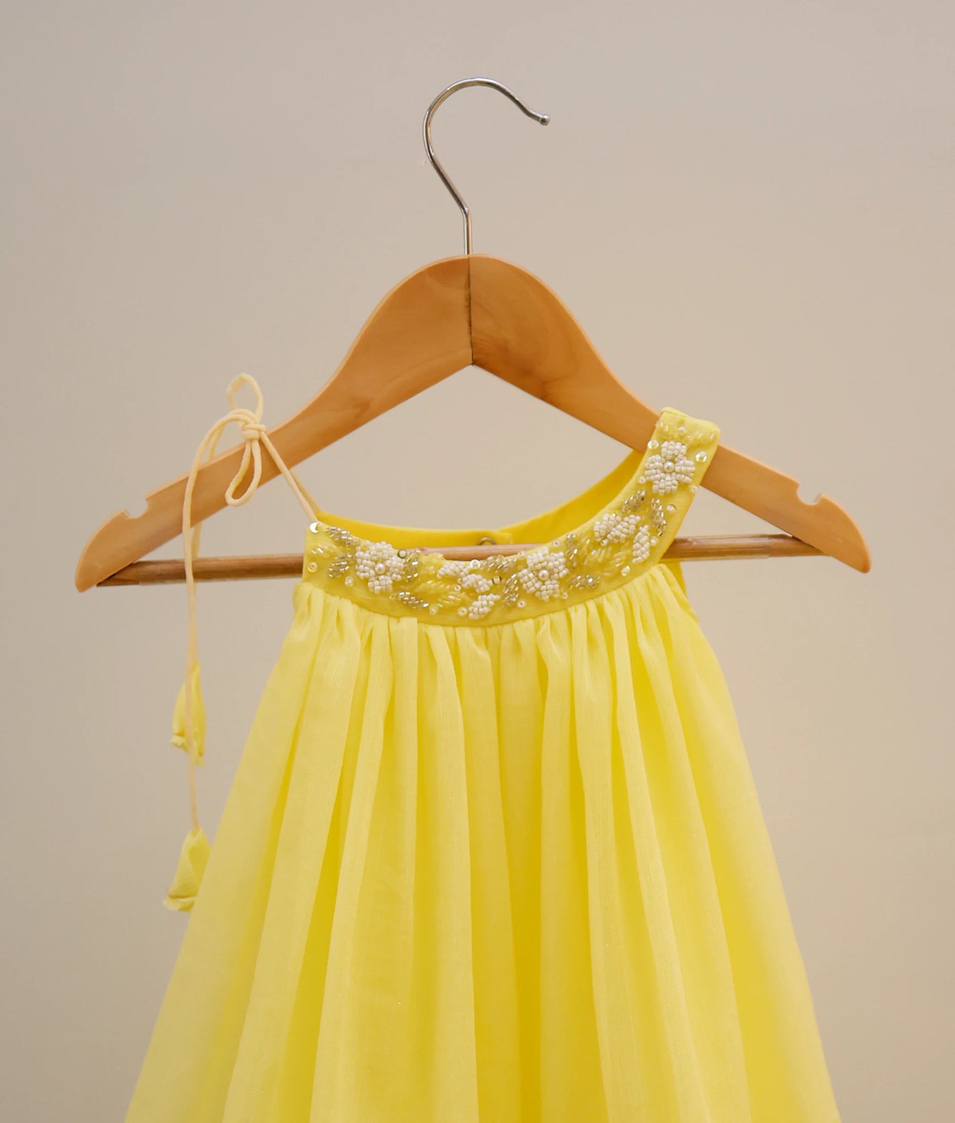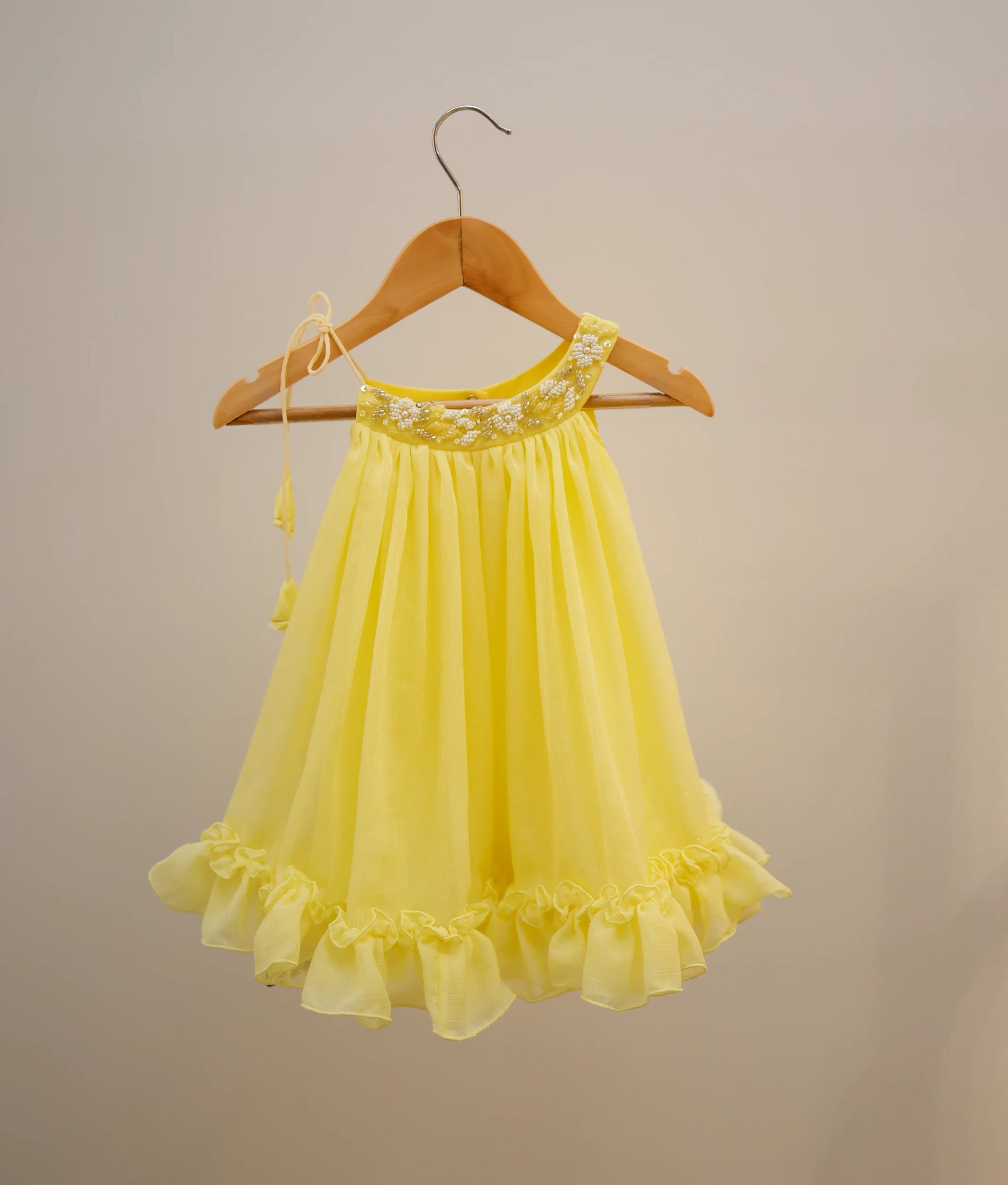 Yellow Shimmer Georgette Handworked Halter-neck Casual Frock For Baby Girl [Ready to ship :2895]