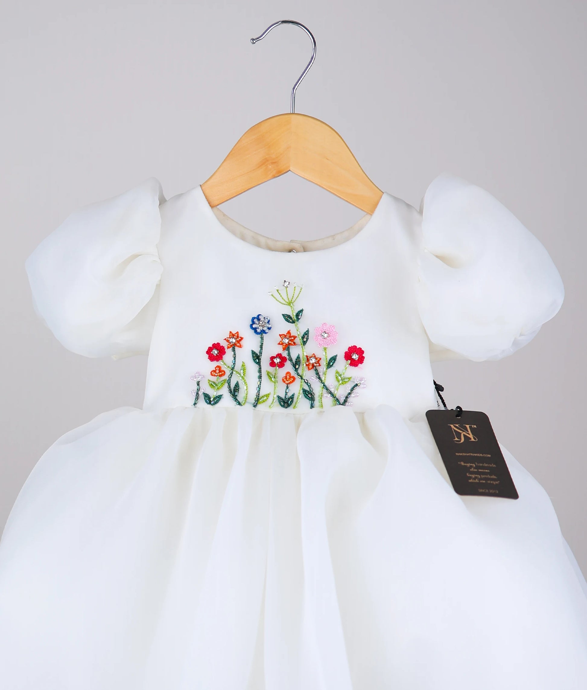 This is a charming and elegant white baby frock, perfect for special occasions. The dress features soft puffed sleeves and a voluminous organza skirt that adds a fairytale-like flair. The bodice and skirt are adorned with intricate multicolored floral embroidery, giving it a fresh, garden-inspired look. The delicate stitching, fine fabric, and detailed craftsmanship make it a standout piece, ideal for birthdays, weddings.