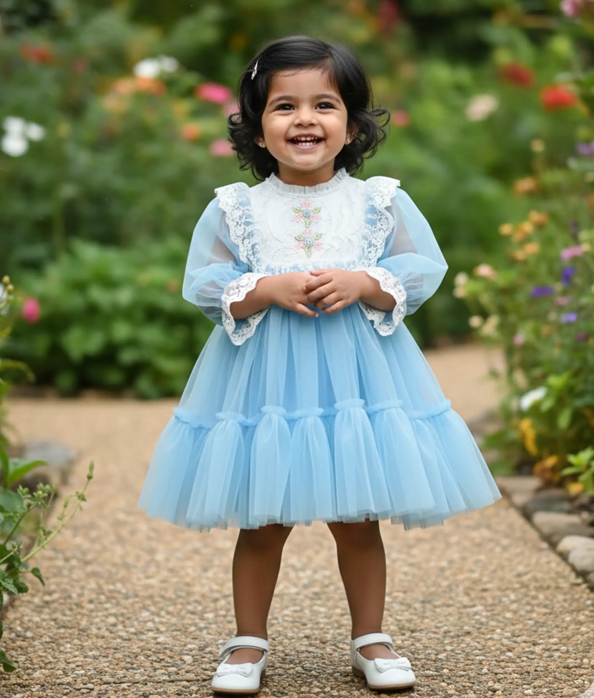 Blue Tulle Net Floral Embroidery Party Wear Frock for Baby Girl [Ready To Ship :5531]