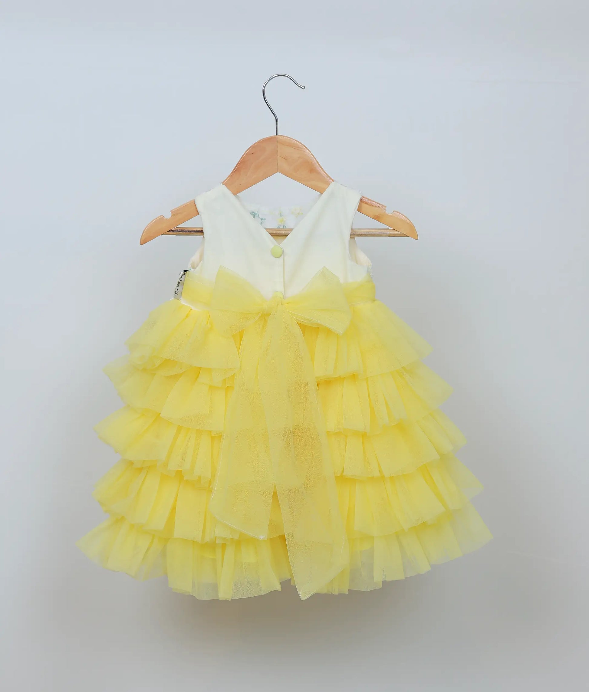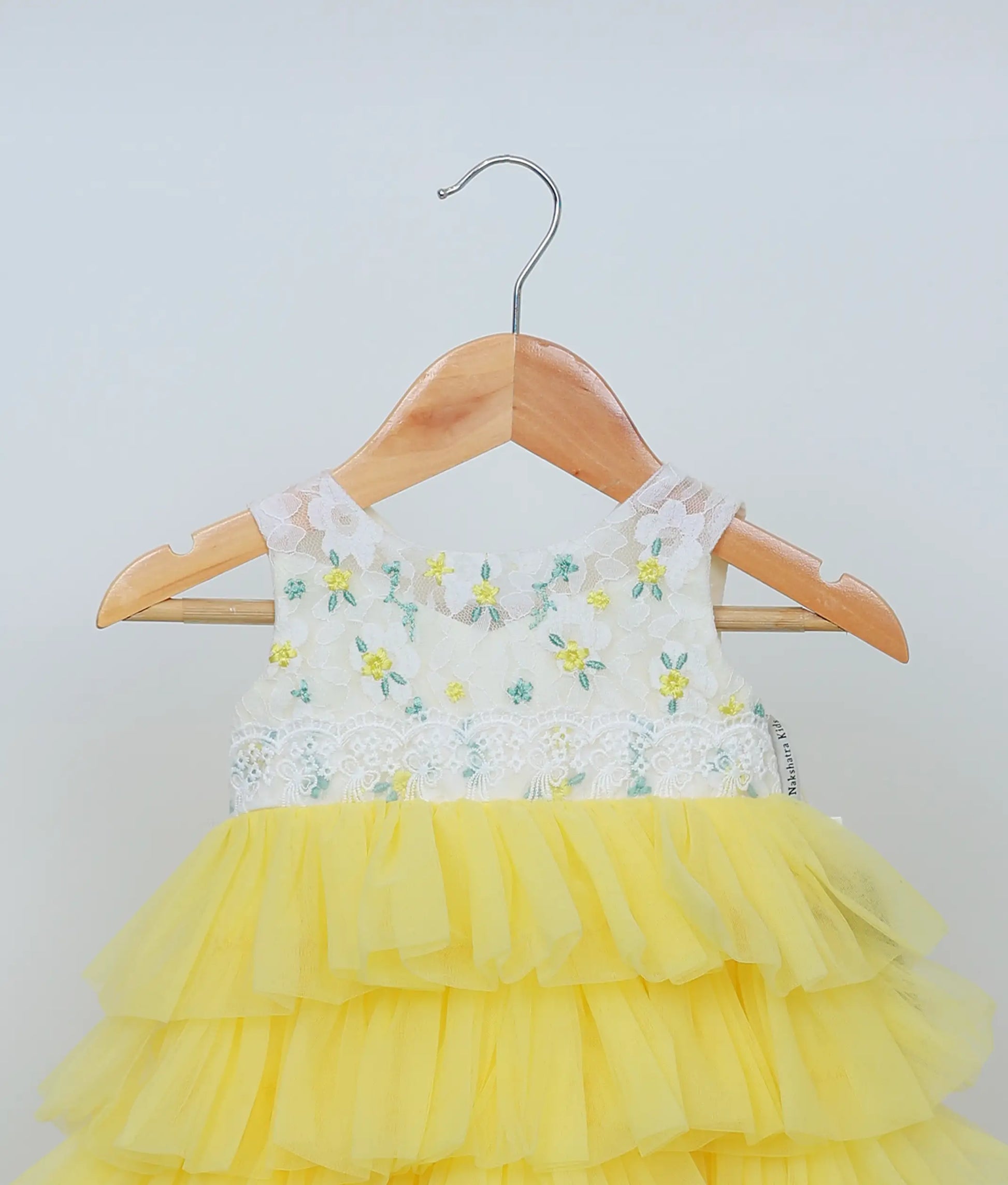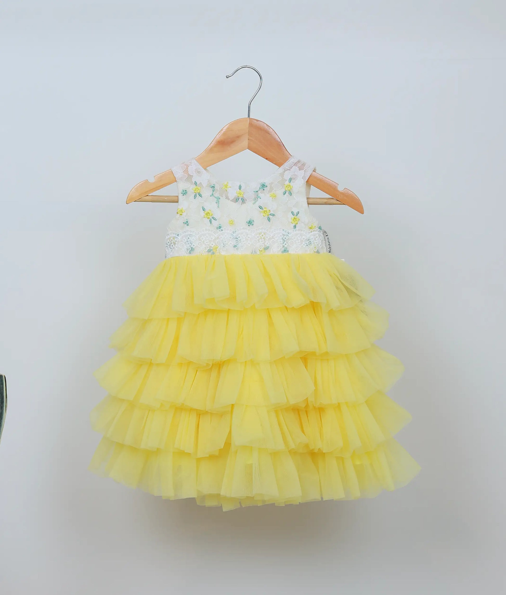 Off white Embroidery Yoke With Yellow Step Skirt Birthday Frock For Baby Girl [Ready to Ship: 2766]