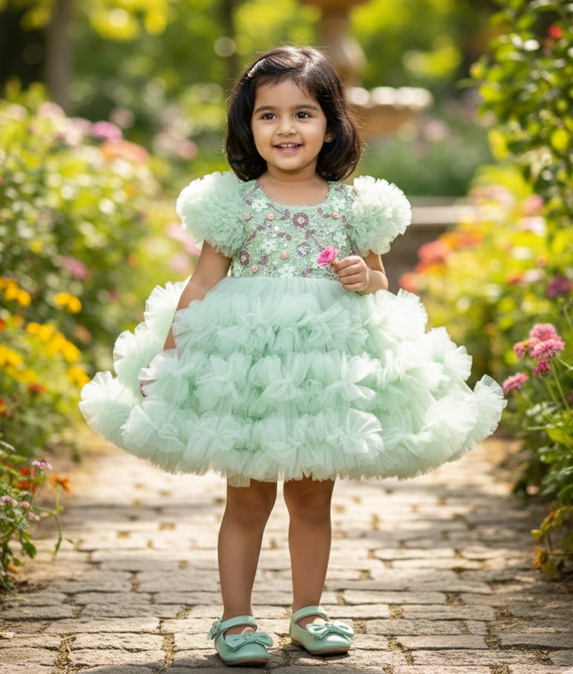 Pastel Green Tulle Net Handworked Birthday Frock For Baby Girl [Ready To Ship: 2128]