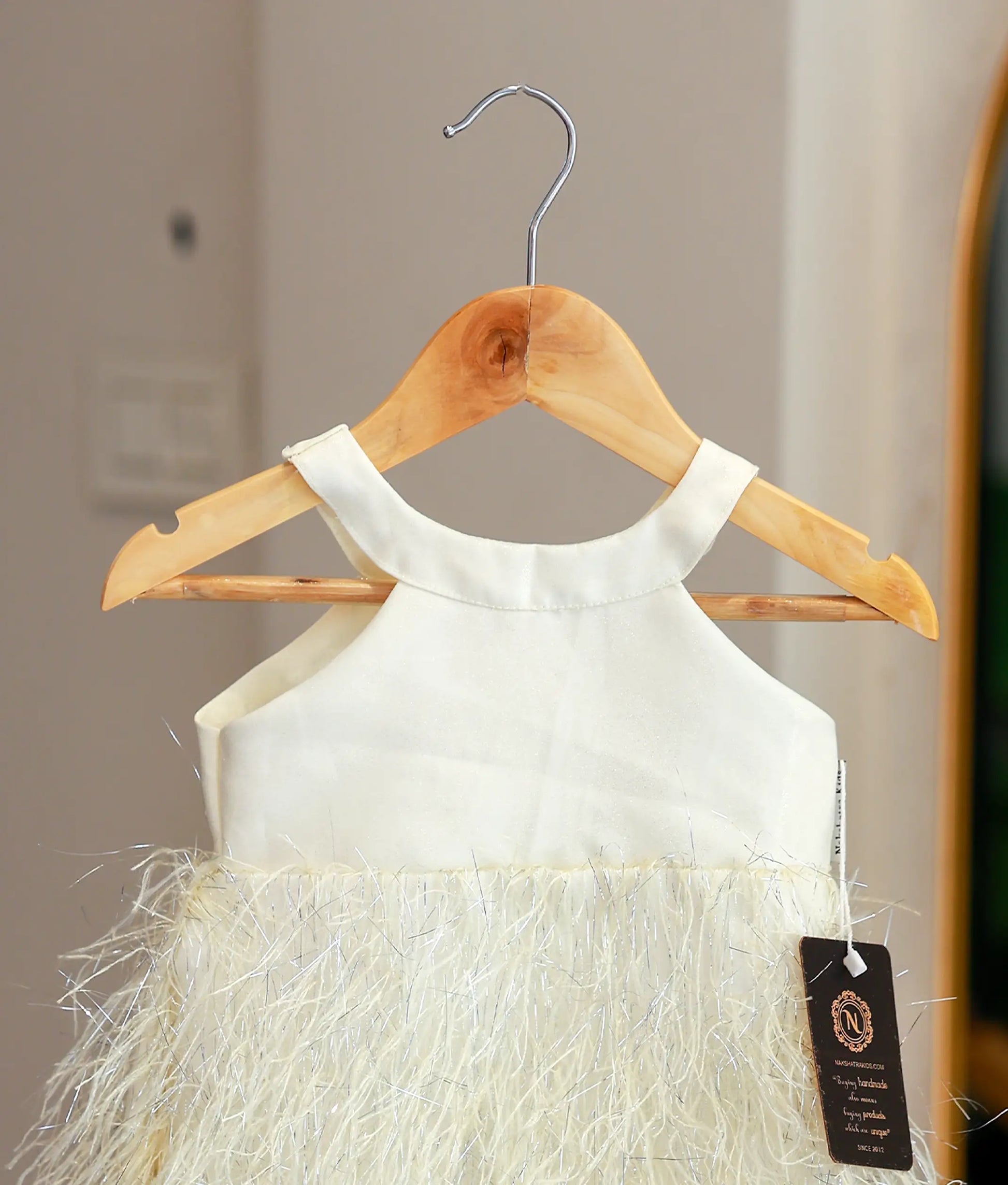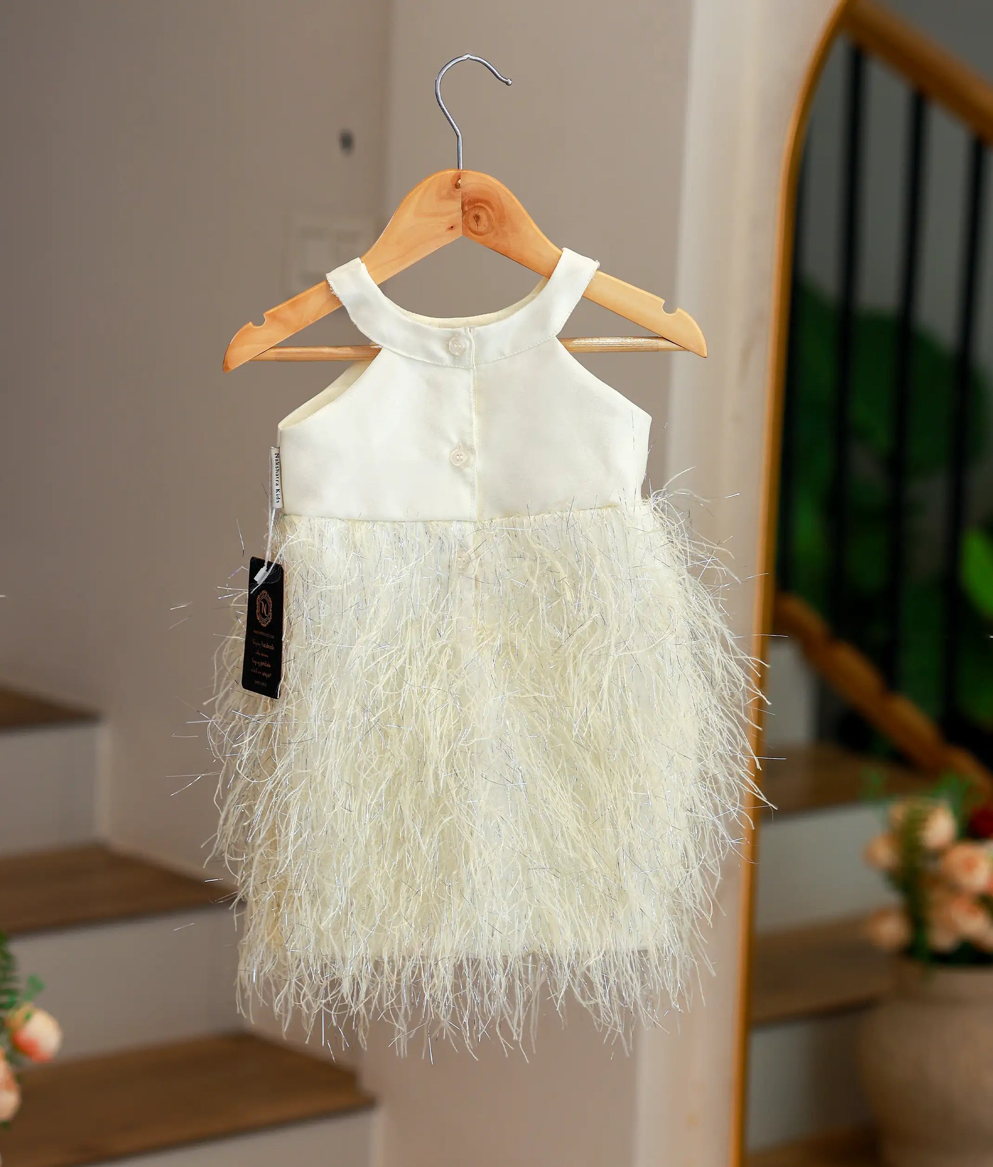 Off-White Tinsel Fringe Fish Cut Frock for Baby Girl [Ready To Ship: 5626]