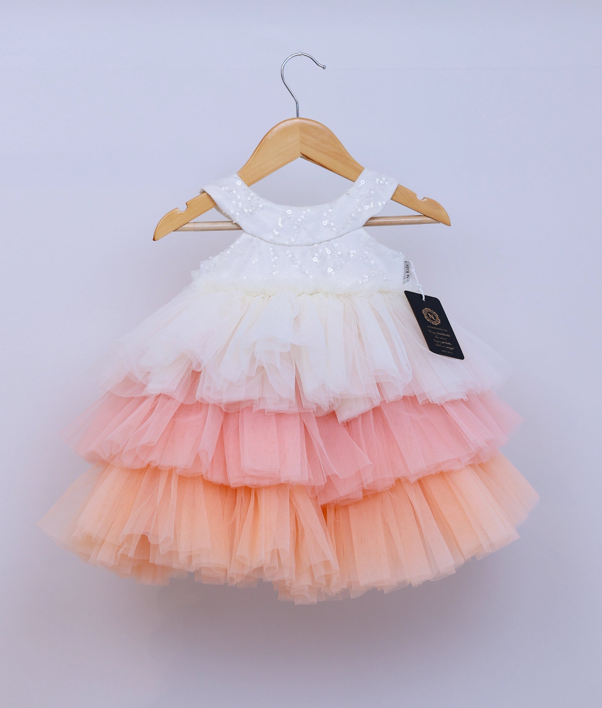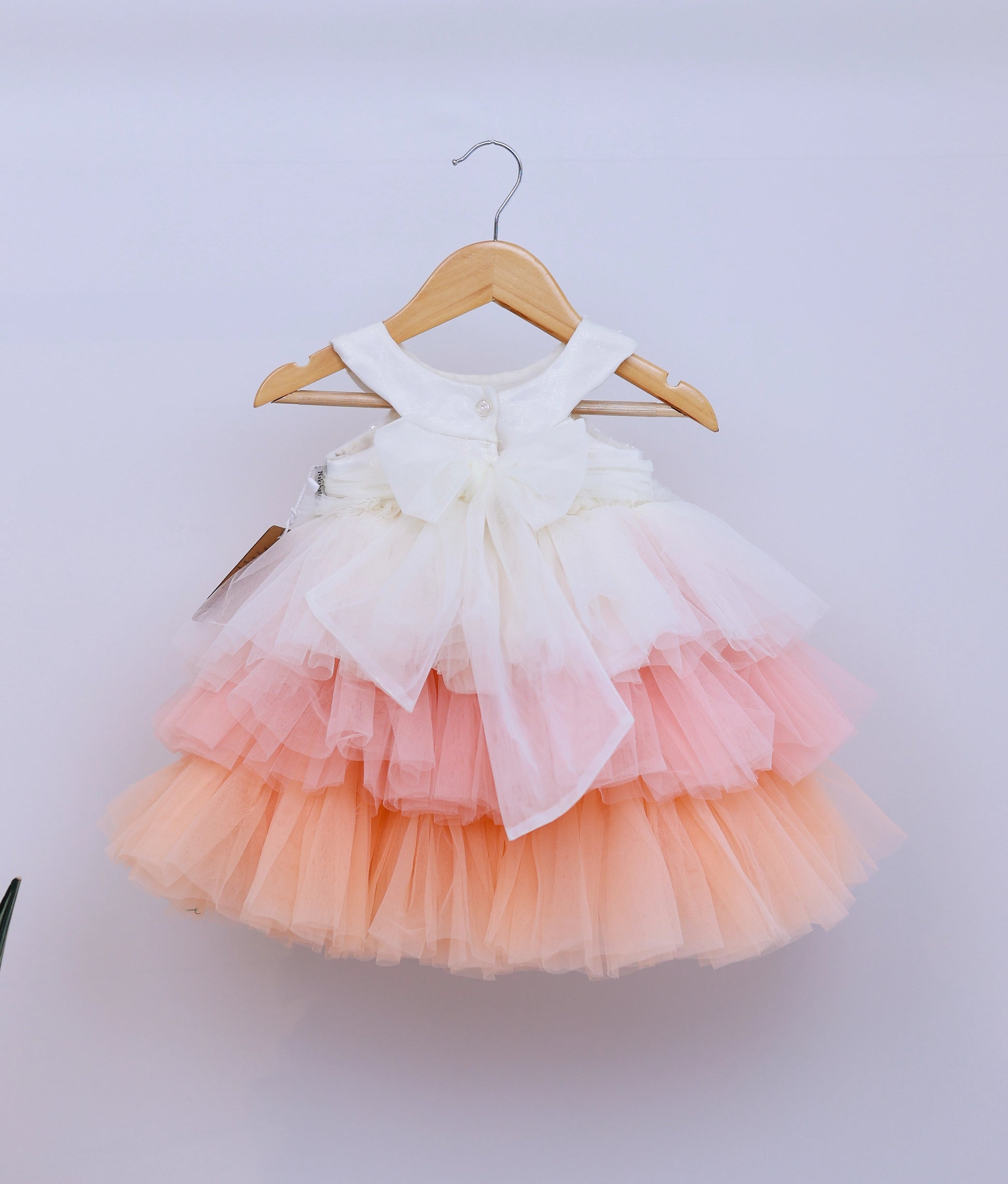 Off-White Work Material Yoke With Peach Step Skirt Birthday Frock For Baby Girl [Ready To Ship: 5304]