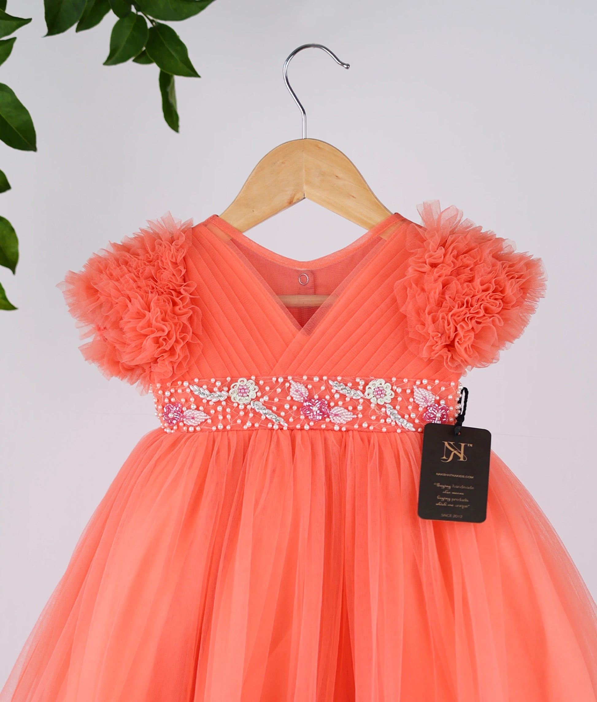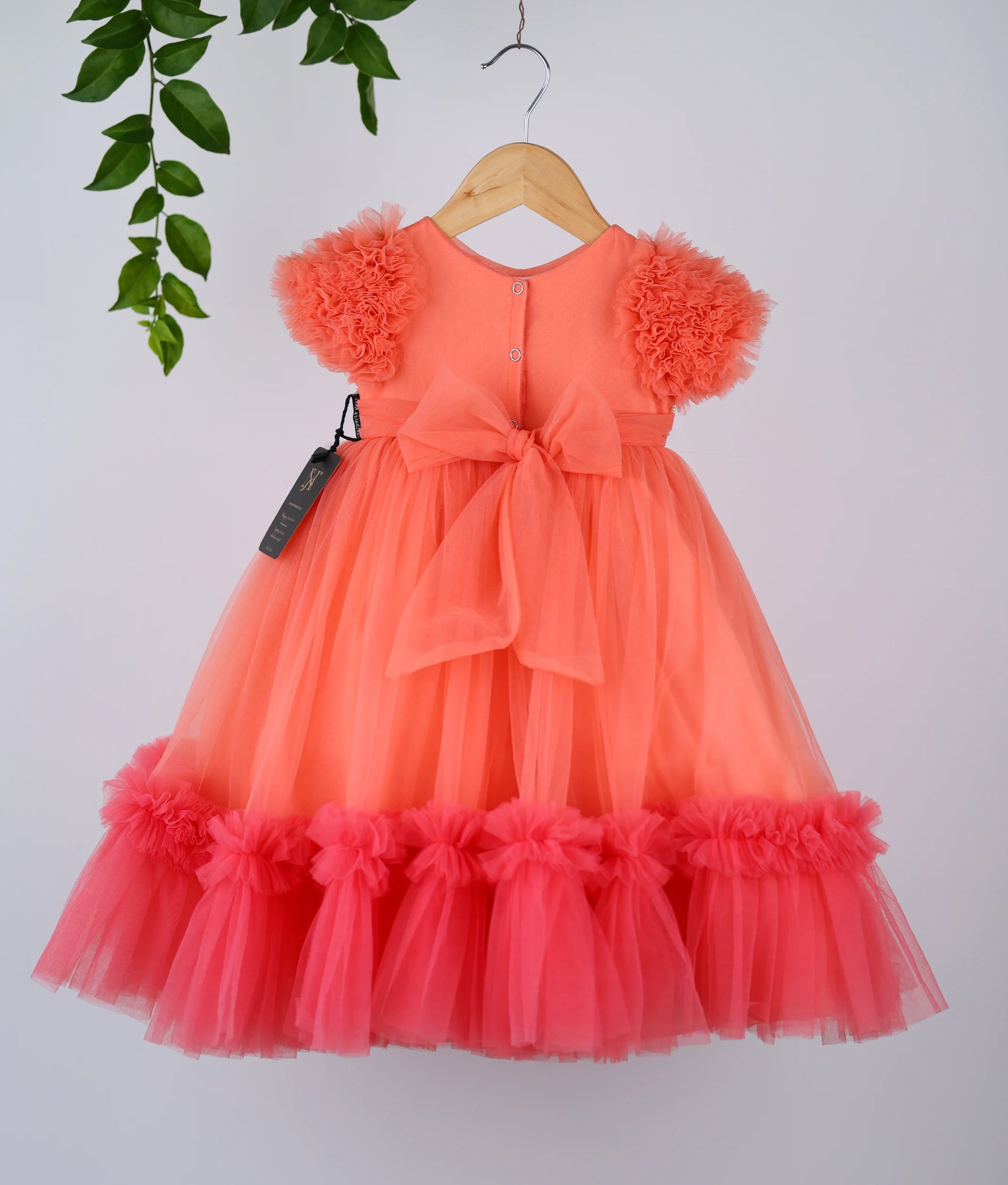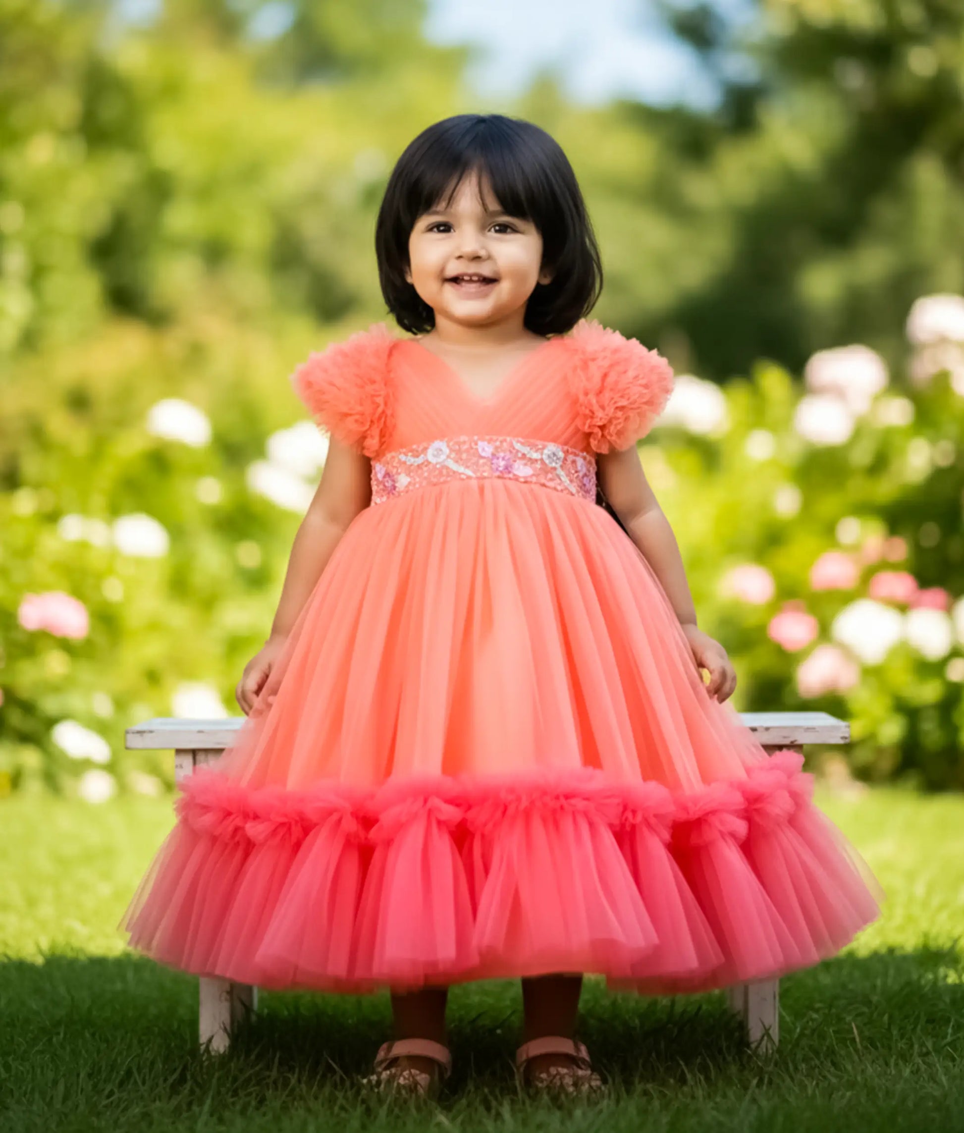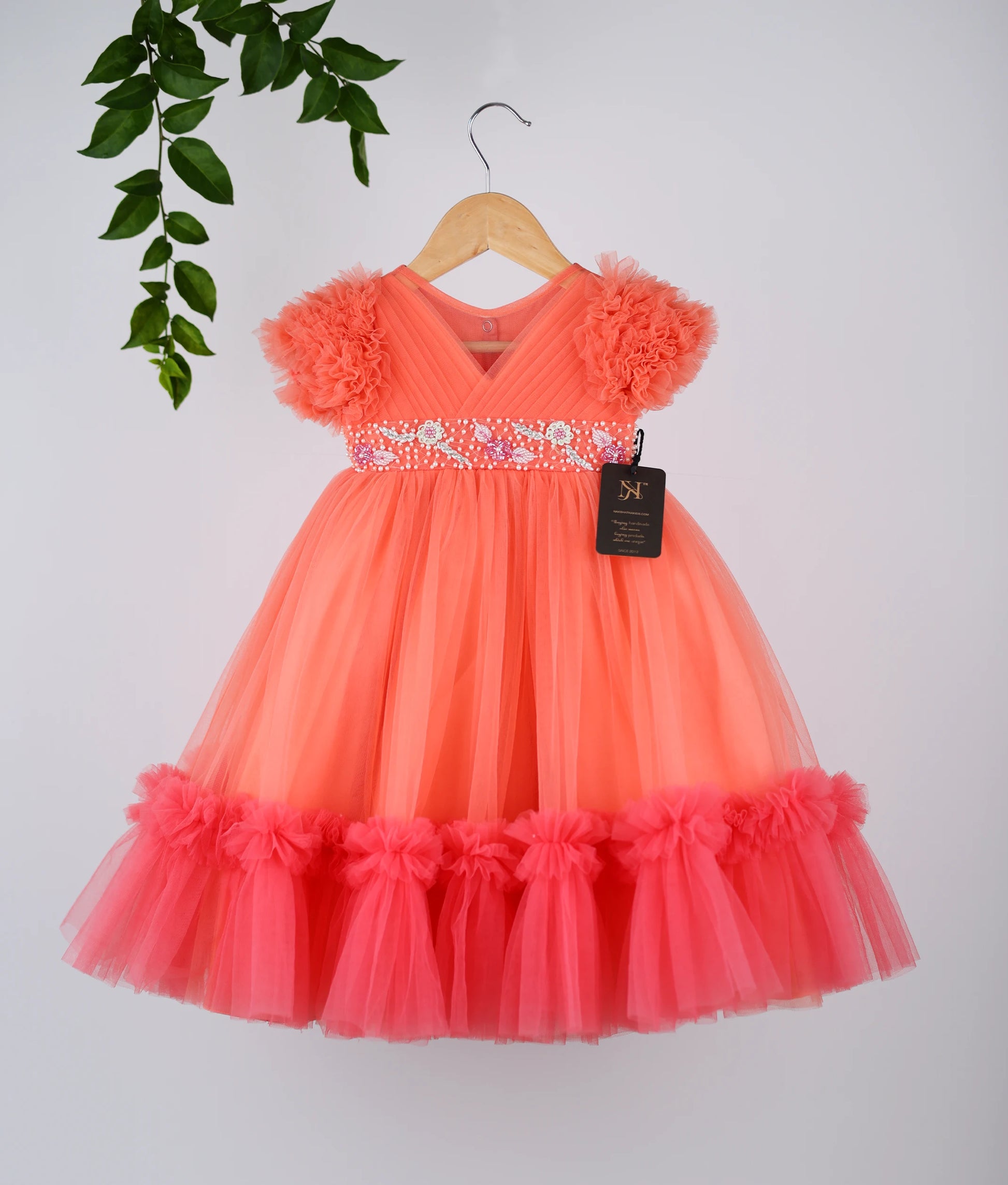 This stunning peach and pink tulle dress features handwork and layered ruffles, perfect for party and birthday celebrations. The handwork design makes it an ideal choice for party and birthday occasions.