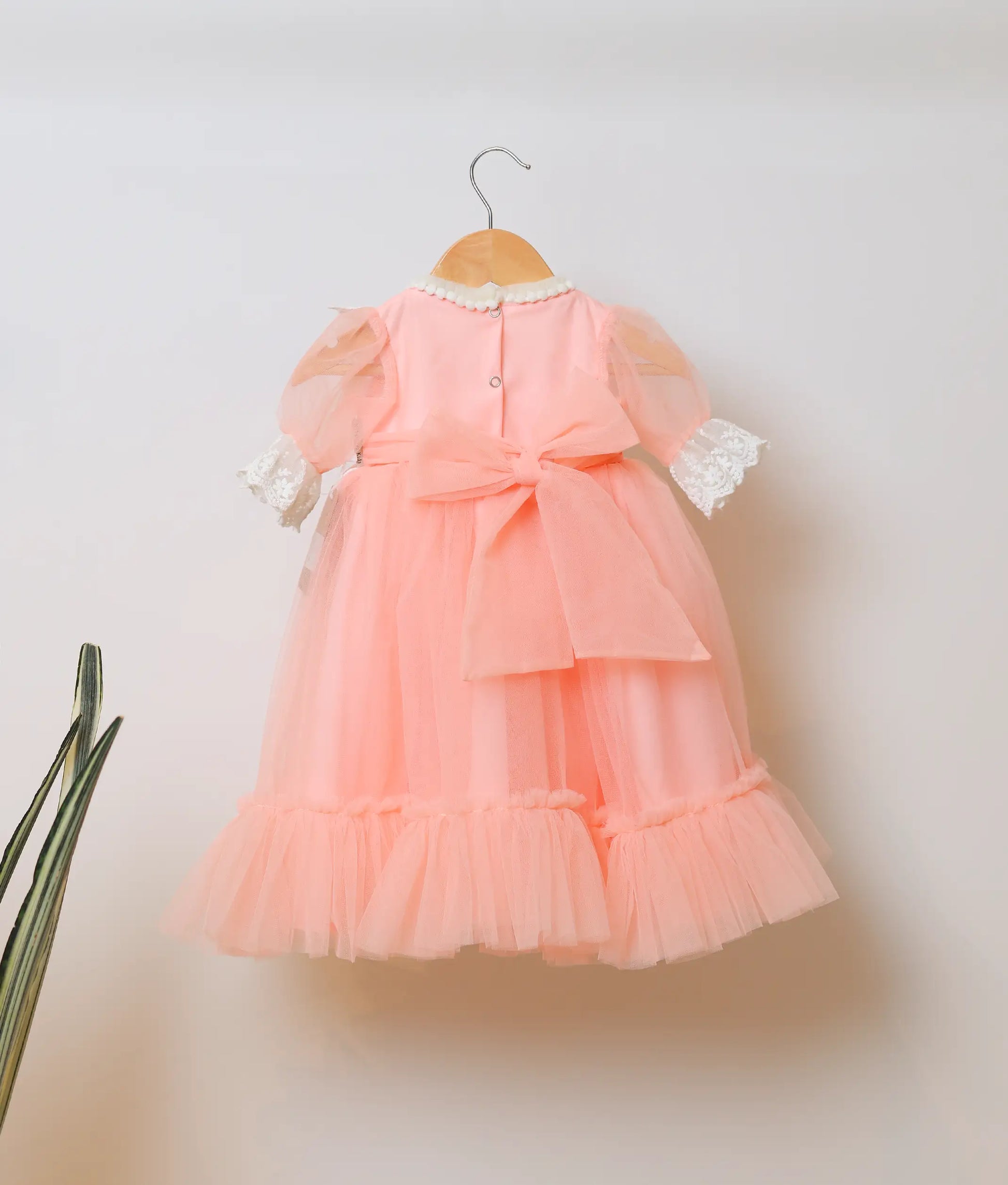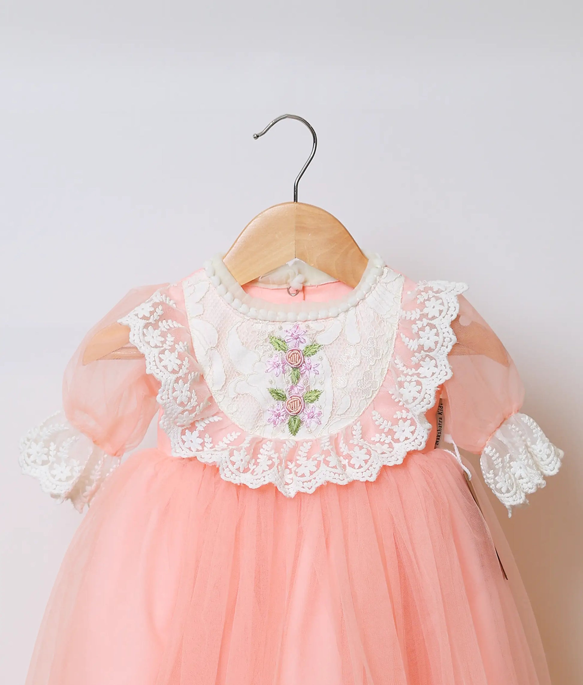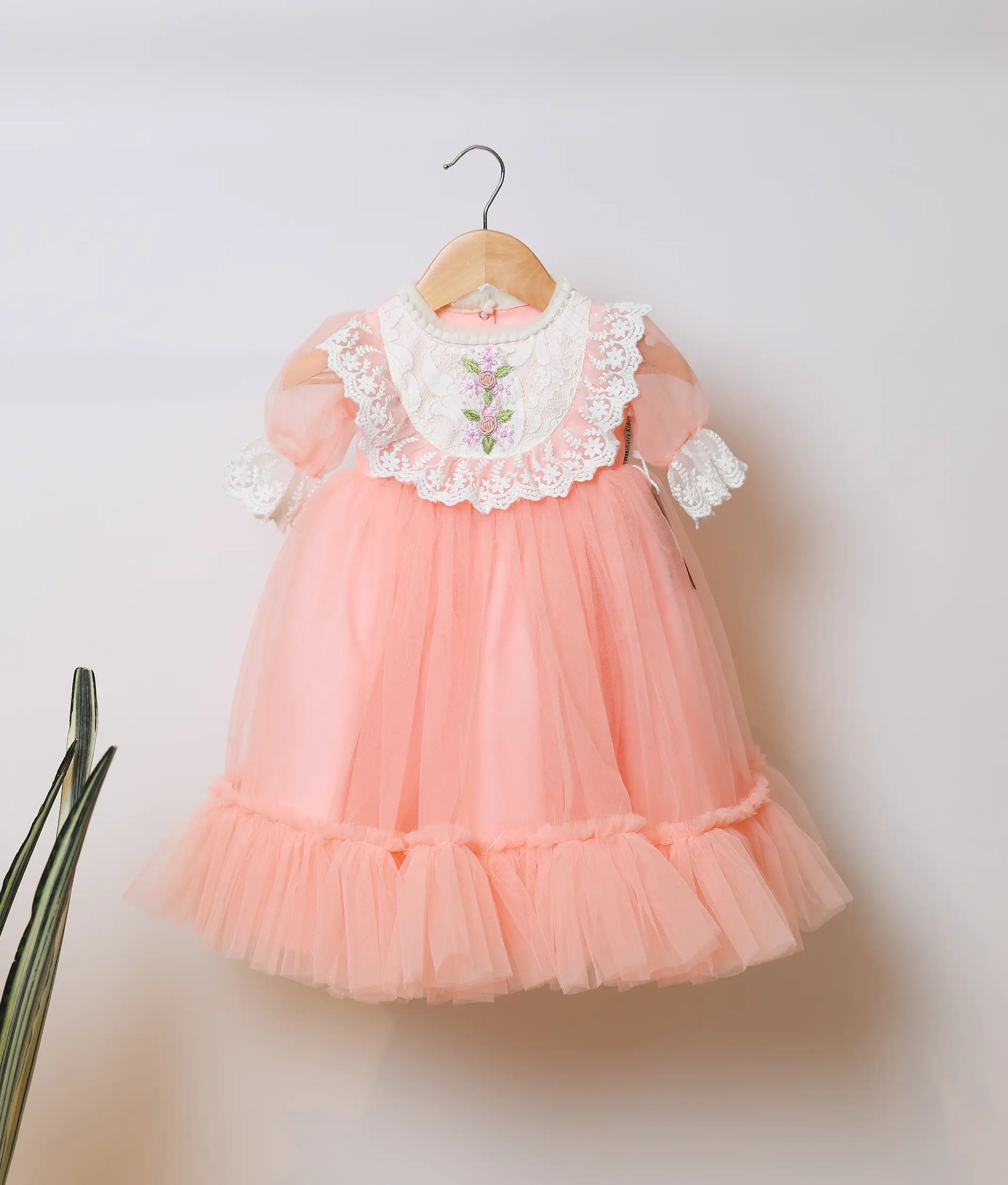 Peach Tulle Net Floral Embroidery Party Wear Frock for Baby Girl [Ready To Ship: 5617]