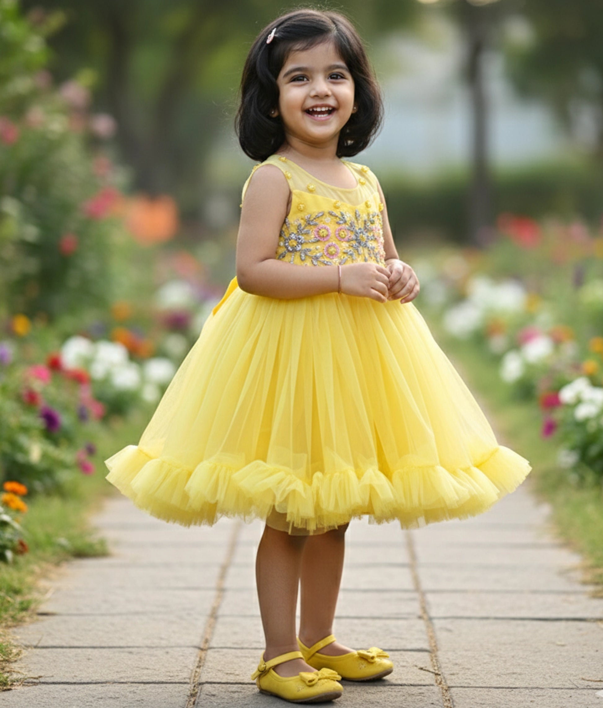 Yellow Tulle Net Handworked Birthday Frock For Baby Girl [Ready To Ship: 6957]