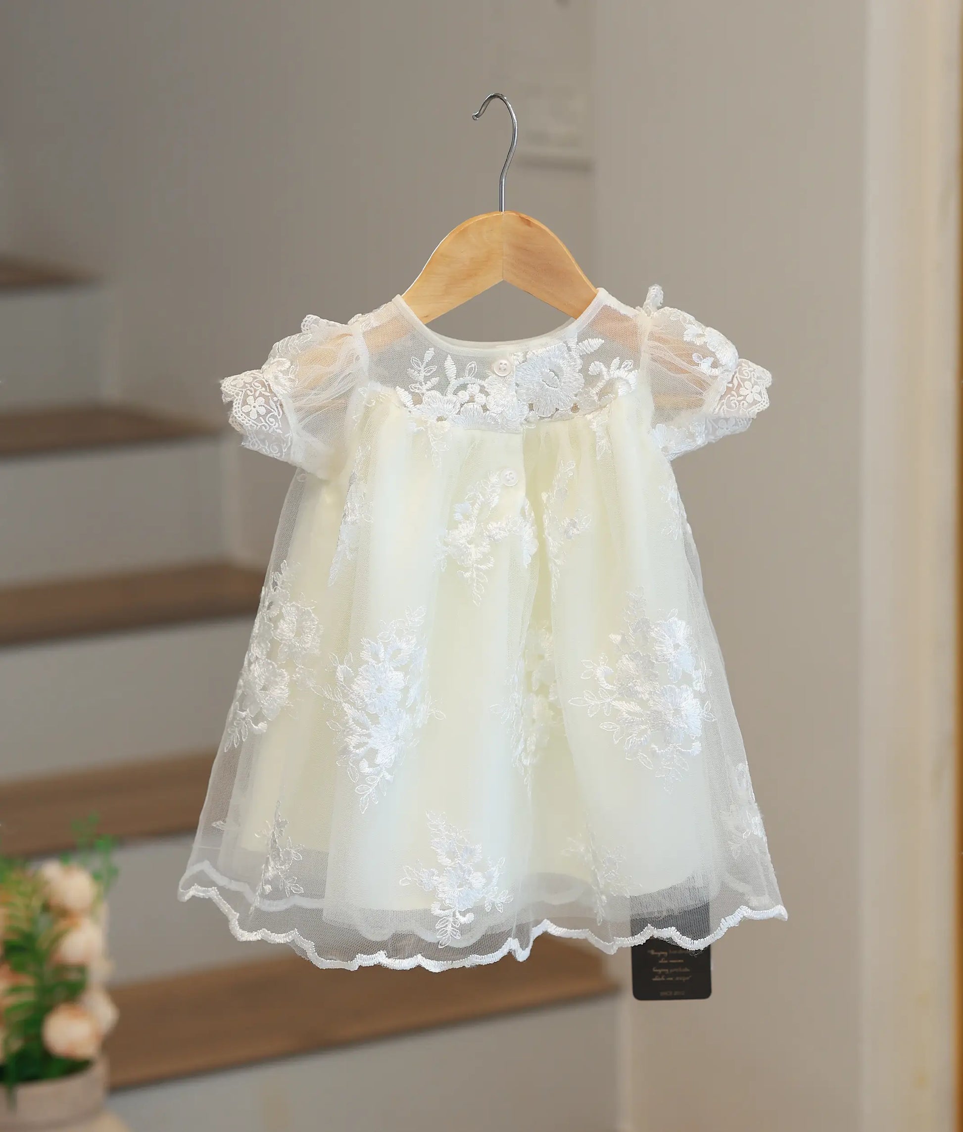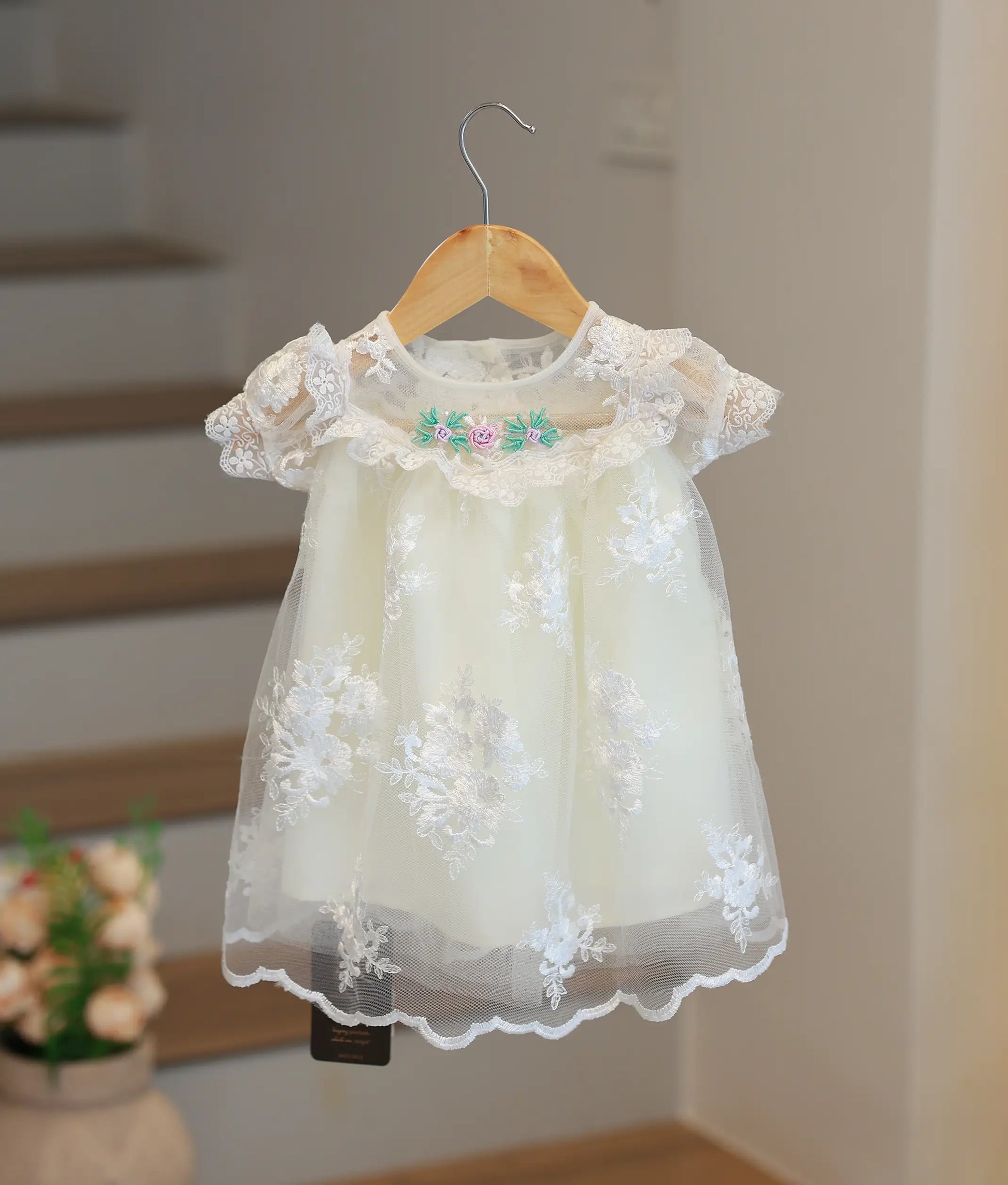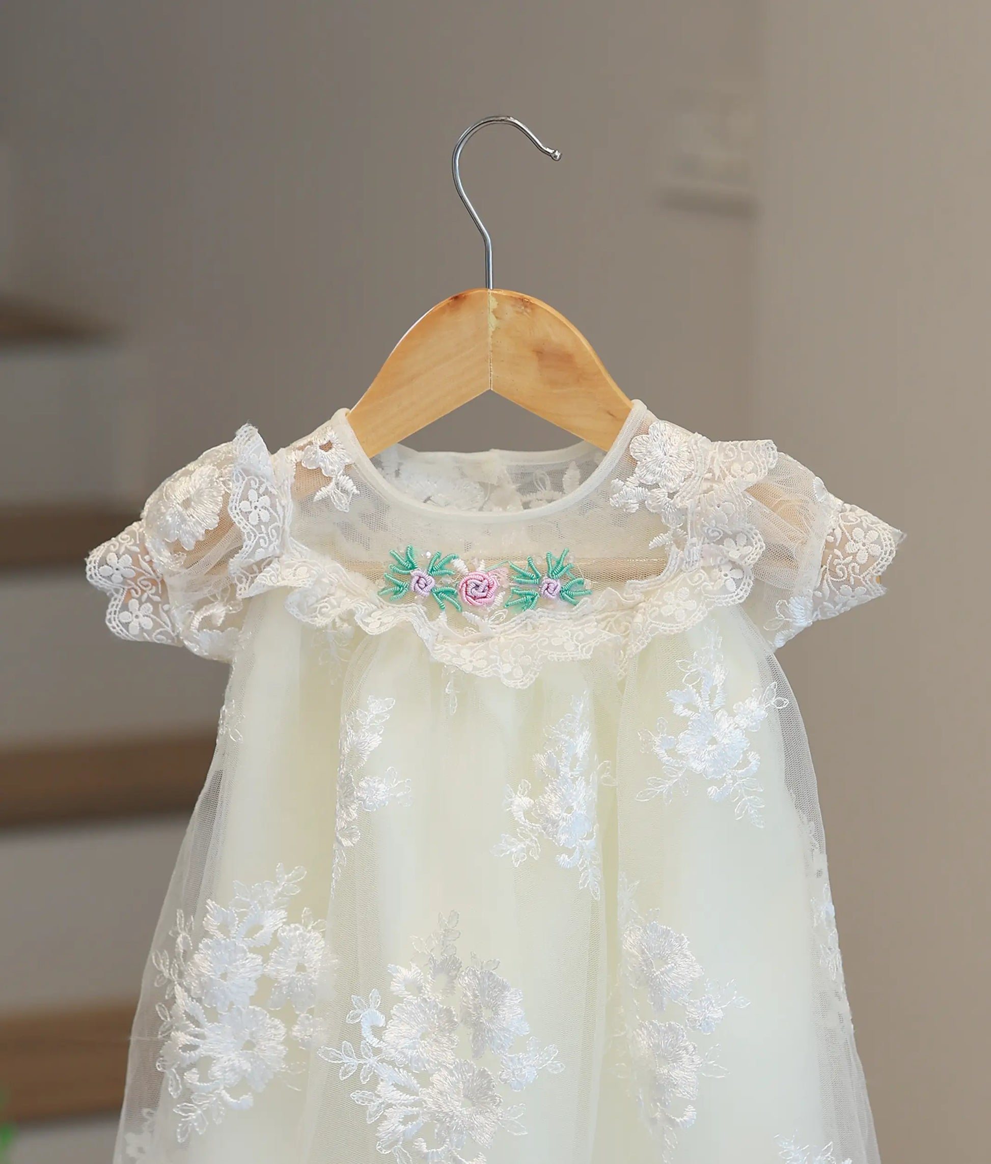 Off-white Work Material Floral Embroidery Baptism Frock For Baby Girl [Ready to Ship: 5062]
