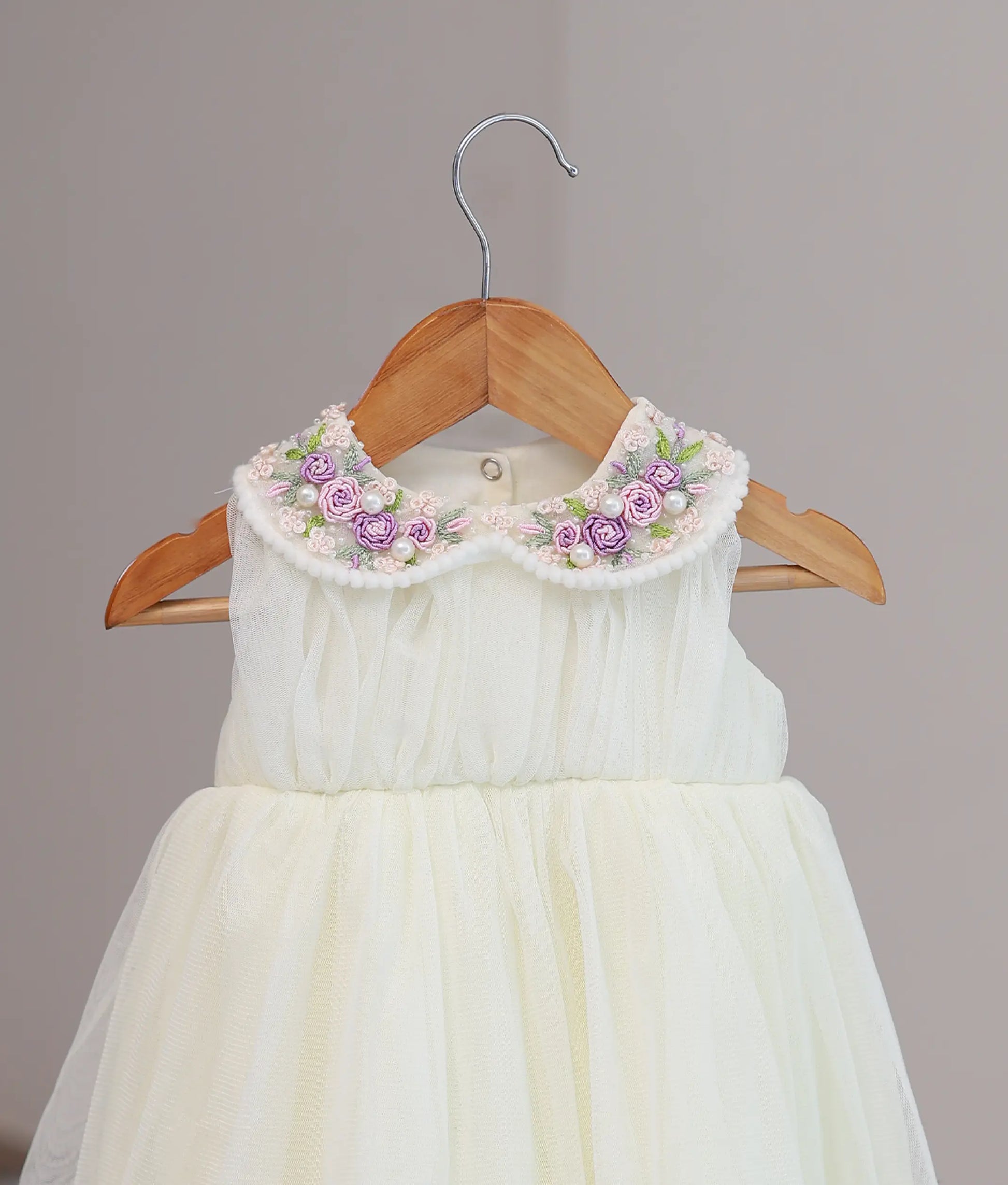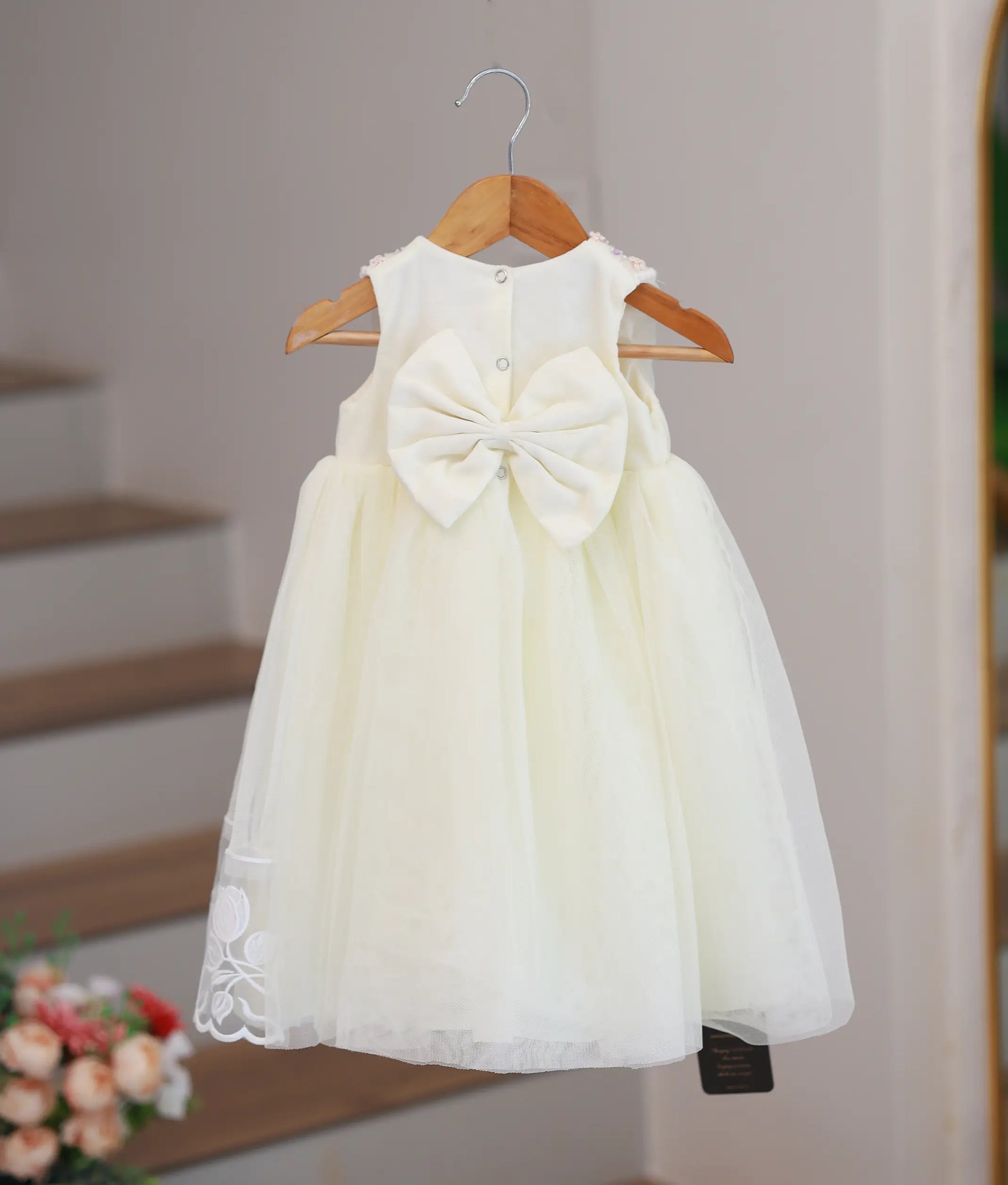 Off-white Tulle Net Handworked Baptism Frock For Baby Baptism [Ready To Ship: 2114A]