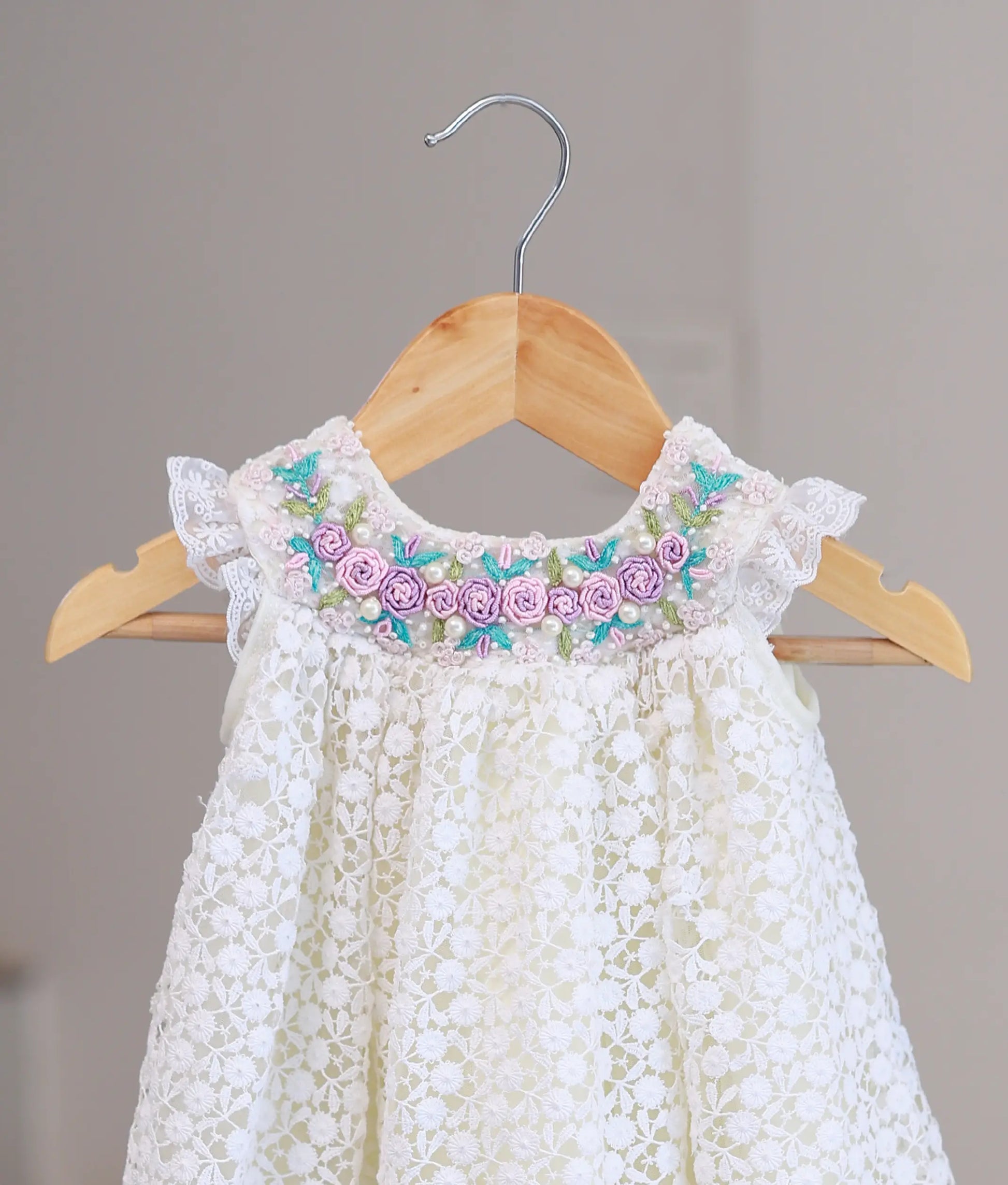 TOP: Neckline adorned with intricate floral handwork in pastel shades