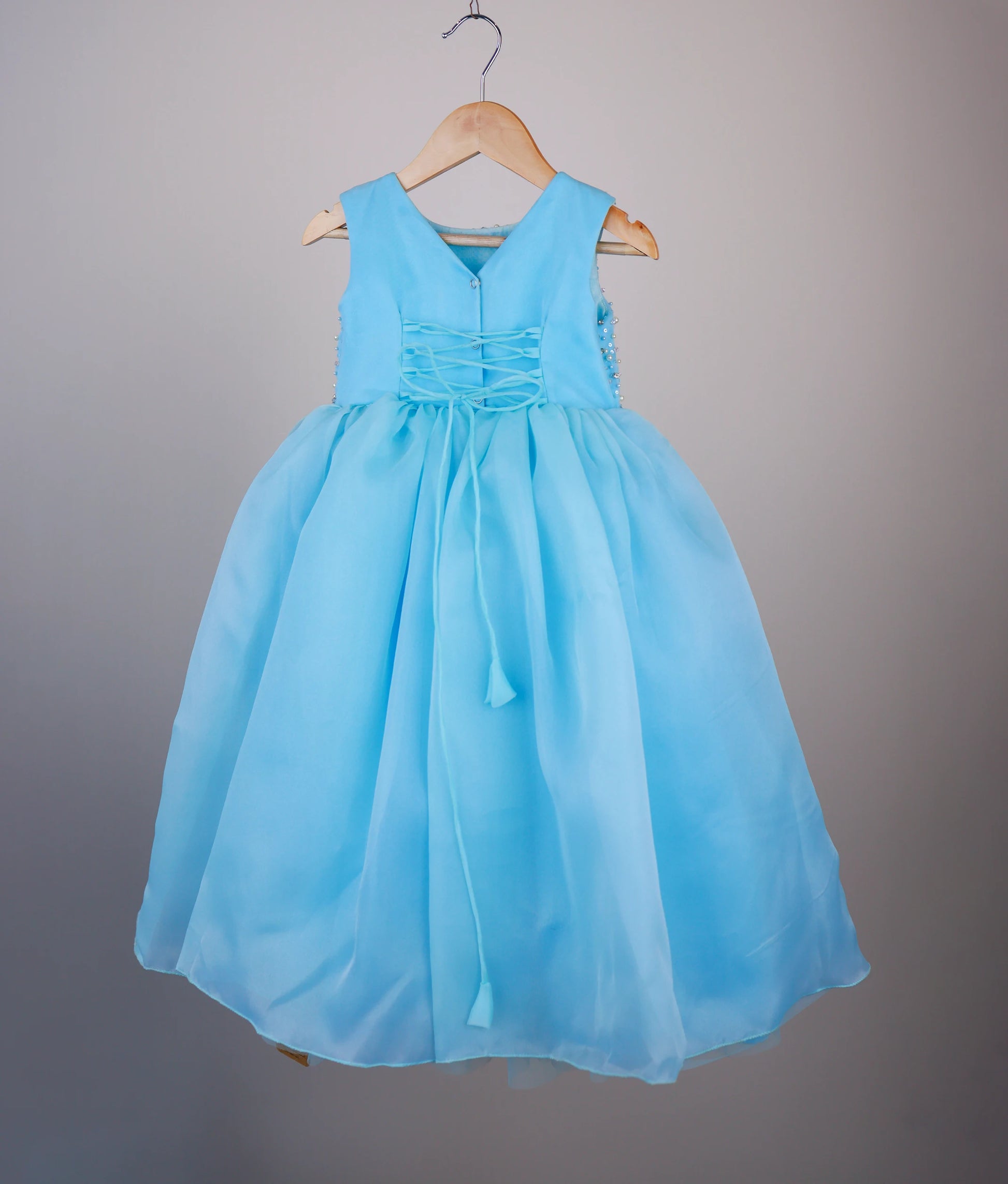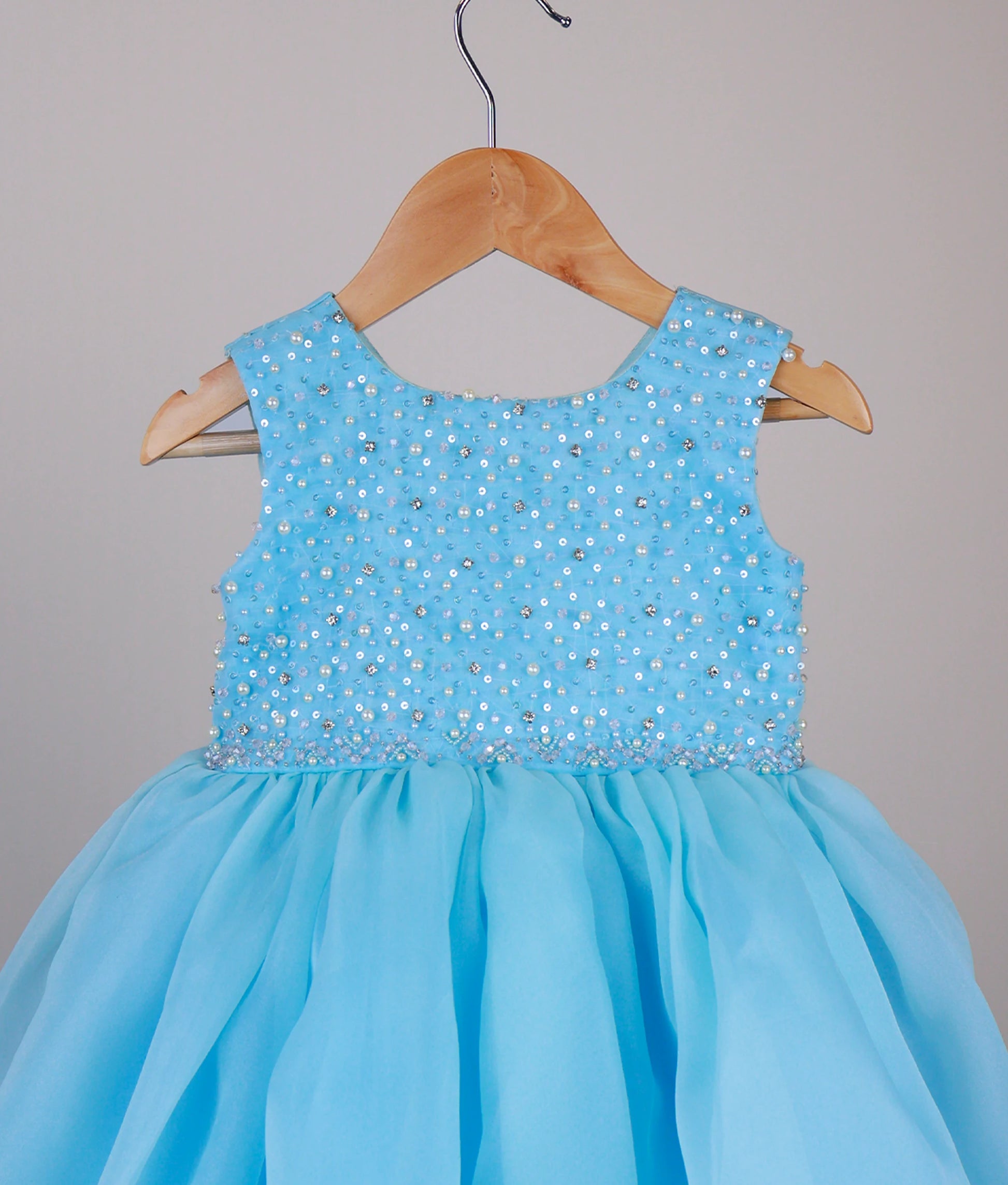 Sky Blue Plain Organza Handworked Birthday Gown For Baby Girl [Ready to ship: 2983]