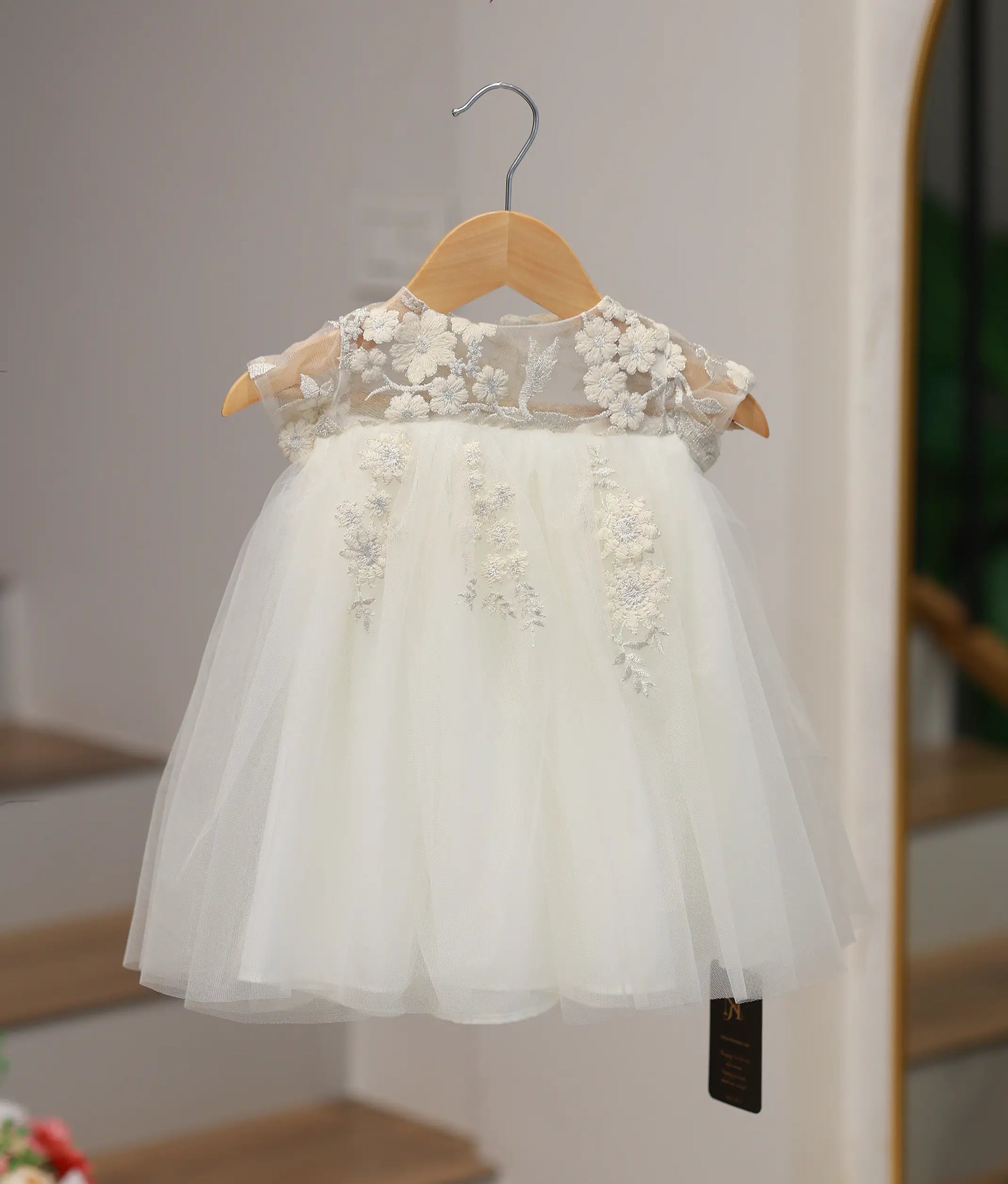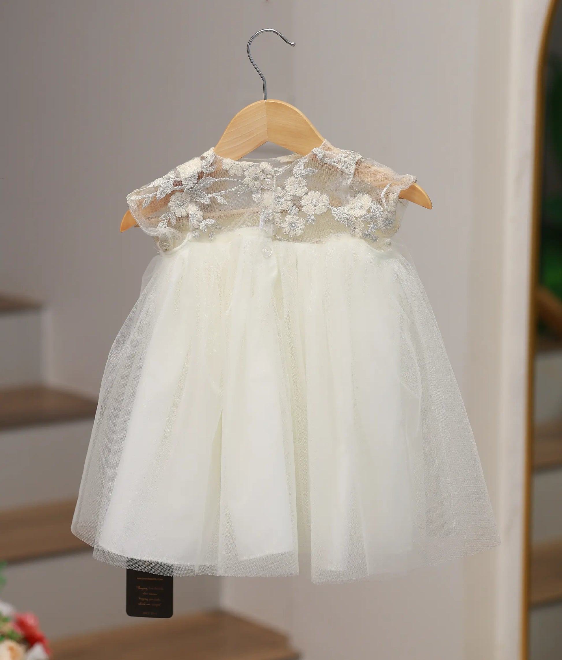 Off-White Floral Applique Work Baptism Frock For Baby Girl [Ready To Ship: 5320]
