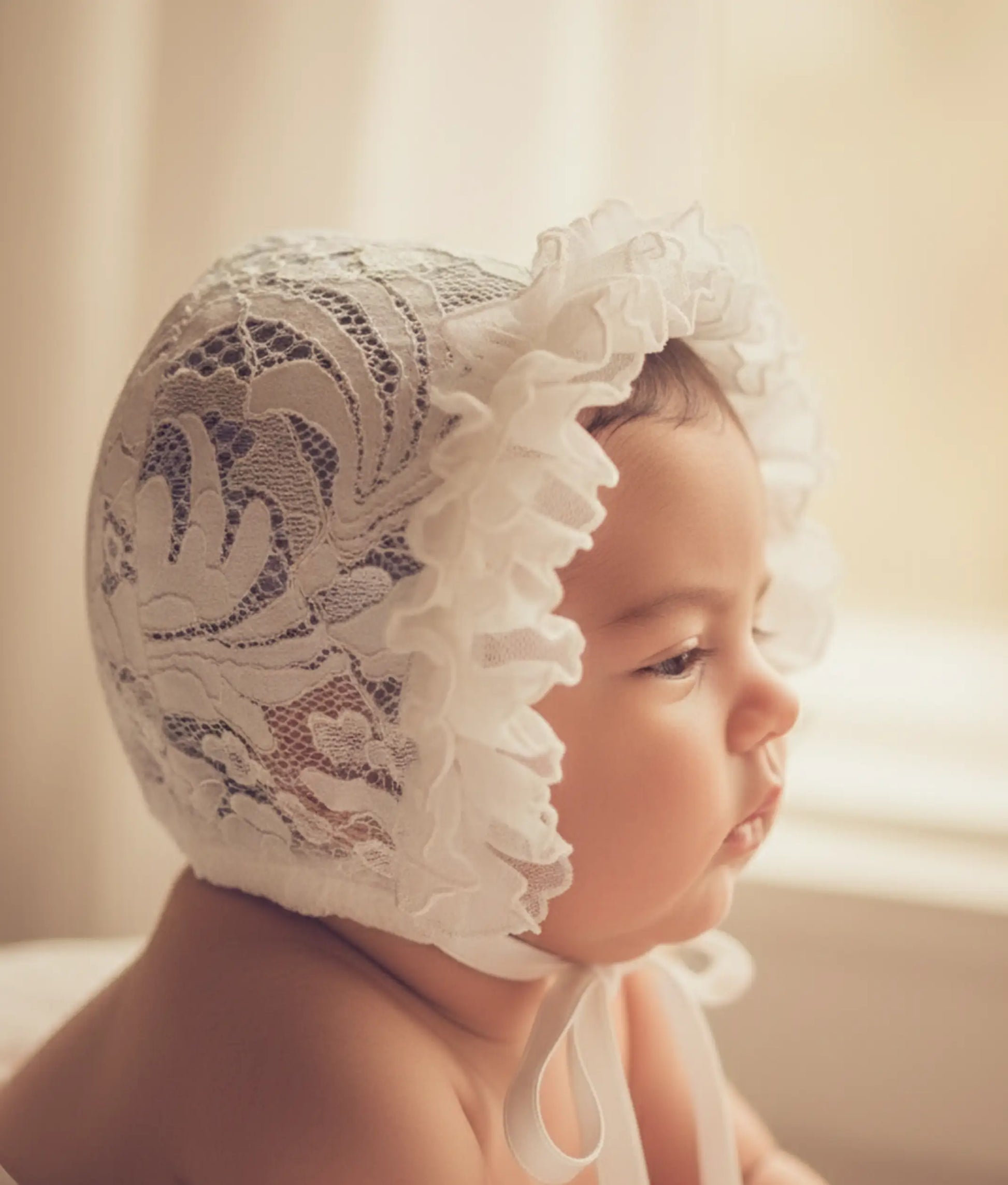 Elegant Off-White Lace Baptism Cap with Soft Ruffled Edge for Your Little One [Ready To Ship: CP08]