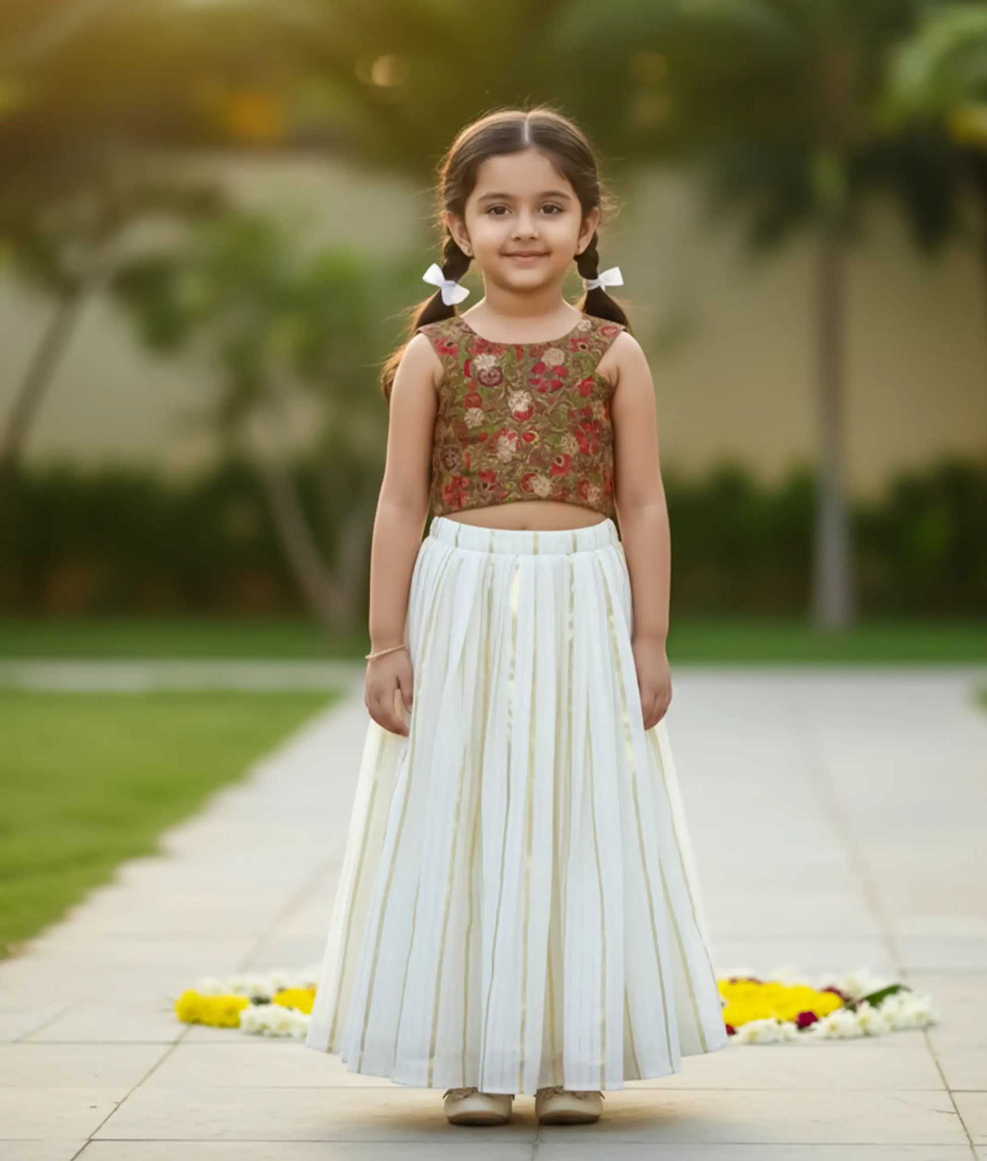 This delightful two-piece dress set for girls is a perfect fusion of tradition and elegance, designed to make your little one shine at any festive or special occasion. The outfit features a beautifully crafted crop top in a rich green base adorned with intricate floral prints in shades of red, gold, beige, and maroon. The detailed threadwork gives it a luxurious and ethnic appeal, making it ideal for weddings, festivals, or cultural functions. Paired with the top is a flowing white skirt featuring soft pleats and delicate golden vertical stripes that add a touch of sparkle and sophistication. The skirt’s light and airy fabric ensures comfort while maintaining an elegant, twirl-worthy silhouette.