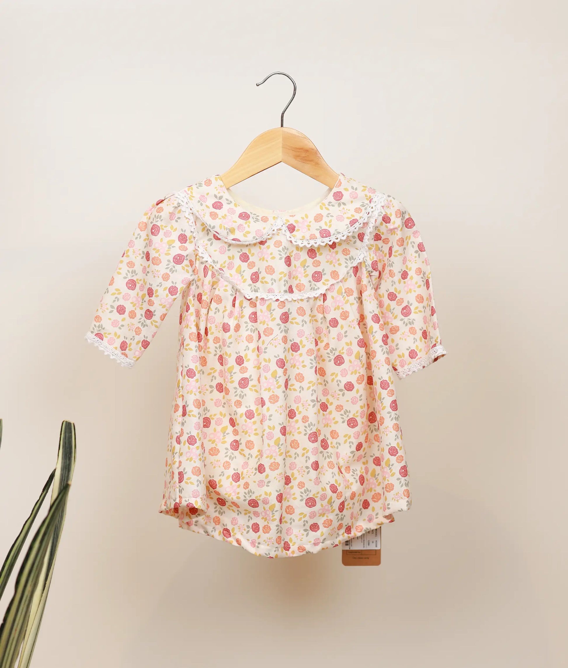 Off-White Floral Printed Cotton Christmas Frock For Baby Girl [Ready To Ship: 5588]