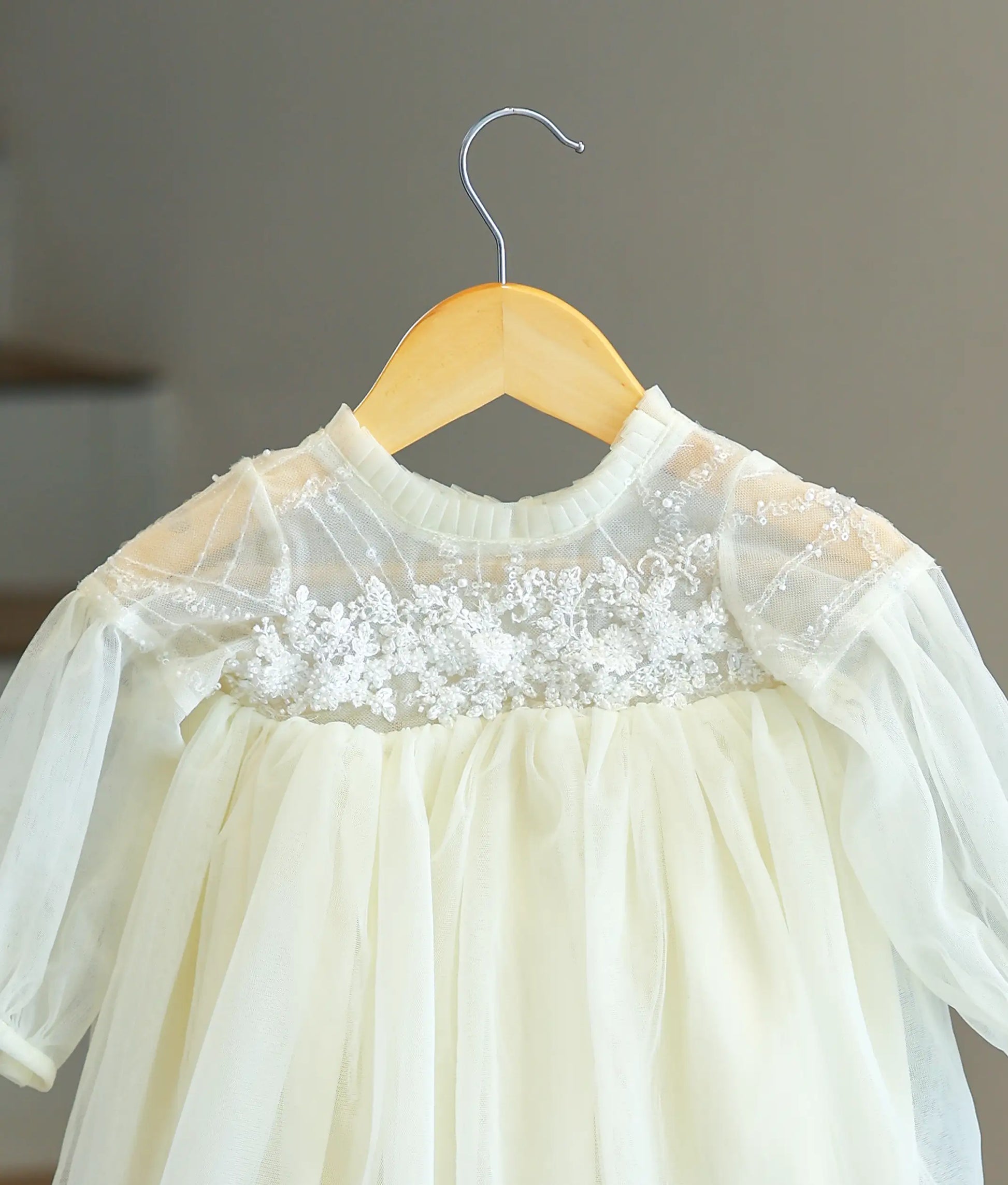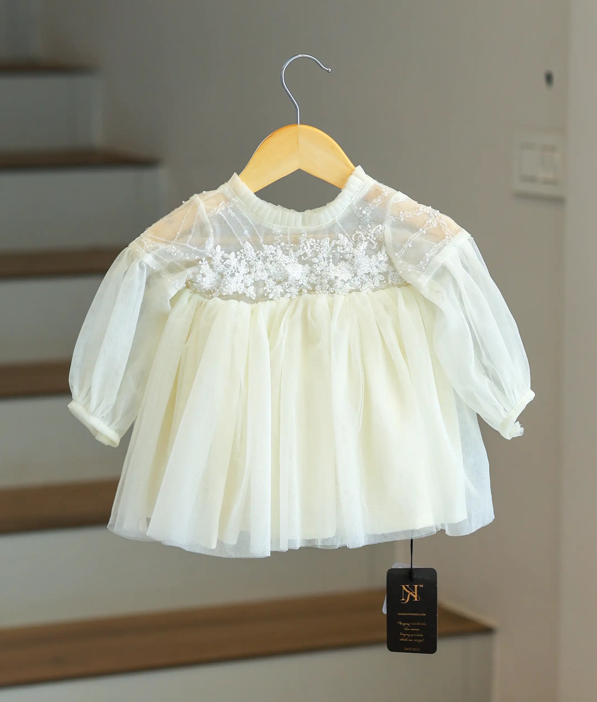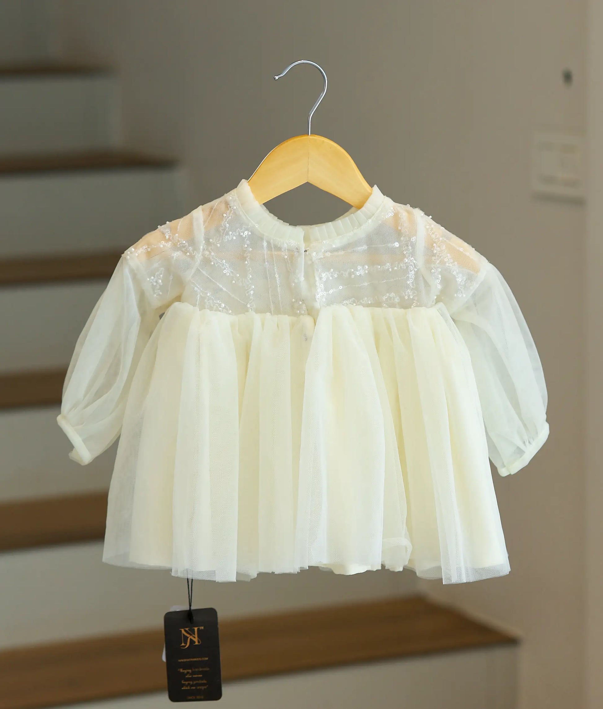 This exquisite dress is the epitome of elegance and charm, designed to make your little one shine on any special occasion. The delicate beadwork and shimmering sequins on the bodice lend a touch of glamour, while the Full sleeves add an ethereal, graceful appeal. The layered tulle skirt creates a voluminous and flowy silhouette, perfect for twirling and turning heads. With its classic round neckline and knee length, this dress strikes the perfect balance between sophistication and playful innocence. Ideal for festive Christmas,this timeless piece ensures your child stands out with effortless style and grace.