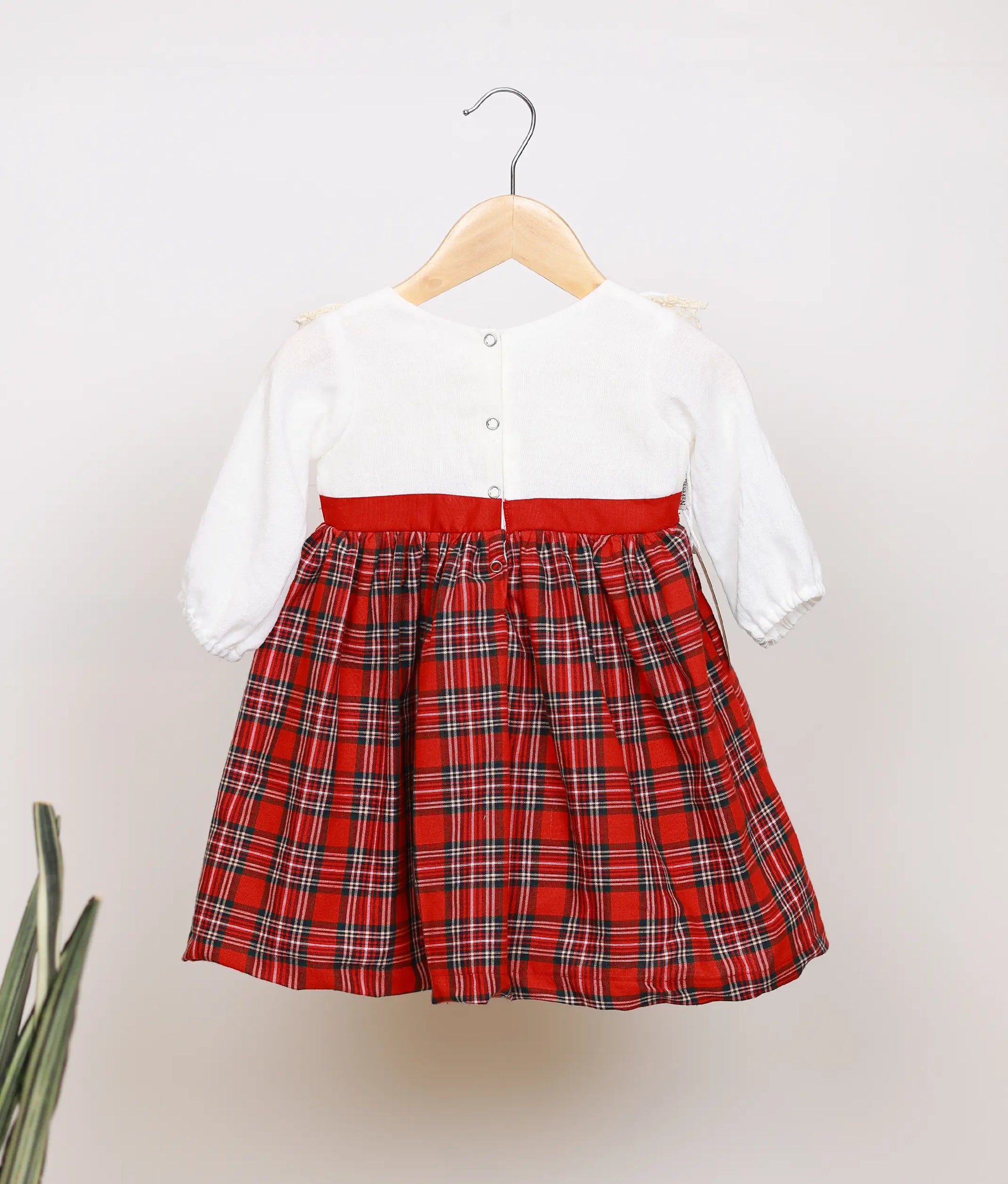 This Red Checked Acoba Lace Yoke Cotton Christmas frock for baby girls features a beautifully fitted white yoke detailed with elegant acoba lace and a matching belt. The round neckline keeps the design classic, while the puff sleeves add a soft, festive charm. The red checked cotton flared skirt creates a graceful silhouette with comfortable movement, making it perfect for Christmas celebrations, parties, and special occasions. Designed in breathable cotton fabric with a below-knee length, this frock ensures both comfort and style for your little one.