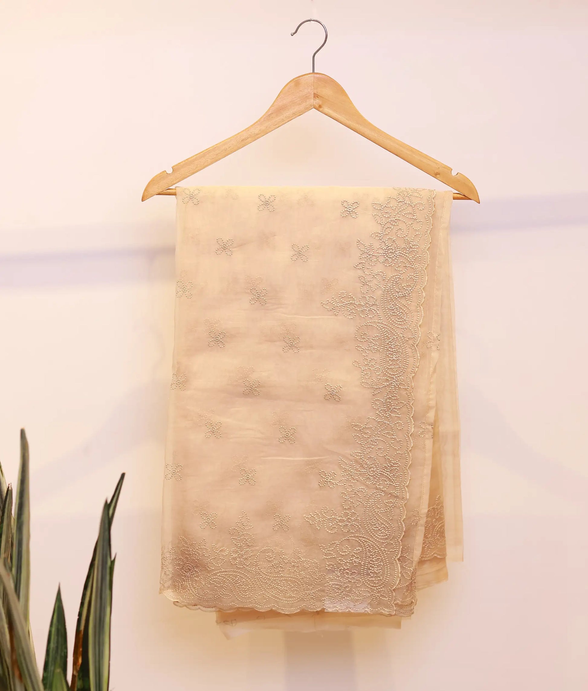 Cream Georgette Saree With Floral Embroidery And Decorative Border [Ready To Ship: C8385]
