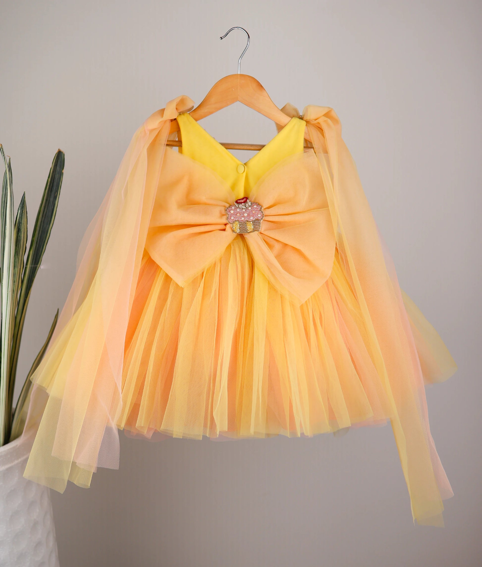 Yellow Tulle Net Handworked Multi Theme Birthday Frock For Baby Girl [Pre order:5191]