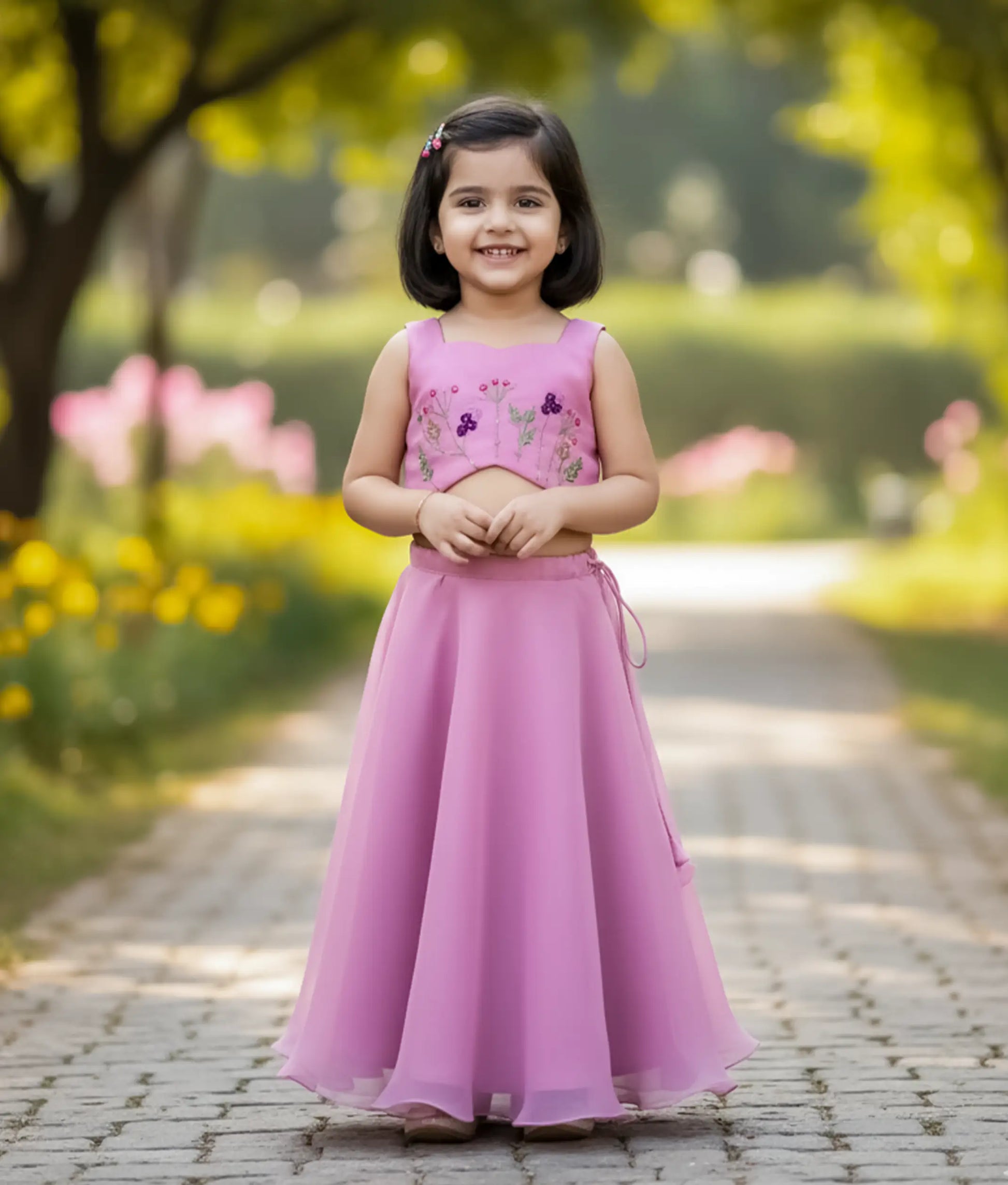 This elegant and charming pastel lavender lehenga choli set for girls is a perfect blend of traditional style and modern grace, ideal for festive occasions, weddings, and birthday celebrations. The sleeveless top is beautifully crafted in a soft pastel lavender hue and features exquisite handworked floral motifs with delicate detailing in pink, green, and purple threads.The matching lehenga skirt is designed in flowing layers of high-quality, lightweight plain organza fabric that gives it a dreamy and graceful drape. The flared silhouette allows for ease of movement and twirl-worthy moments, making it a favorite for little fashionistas.