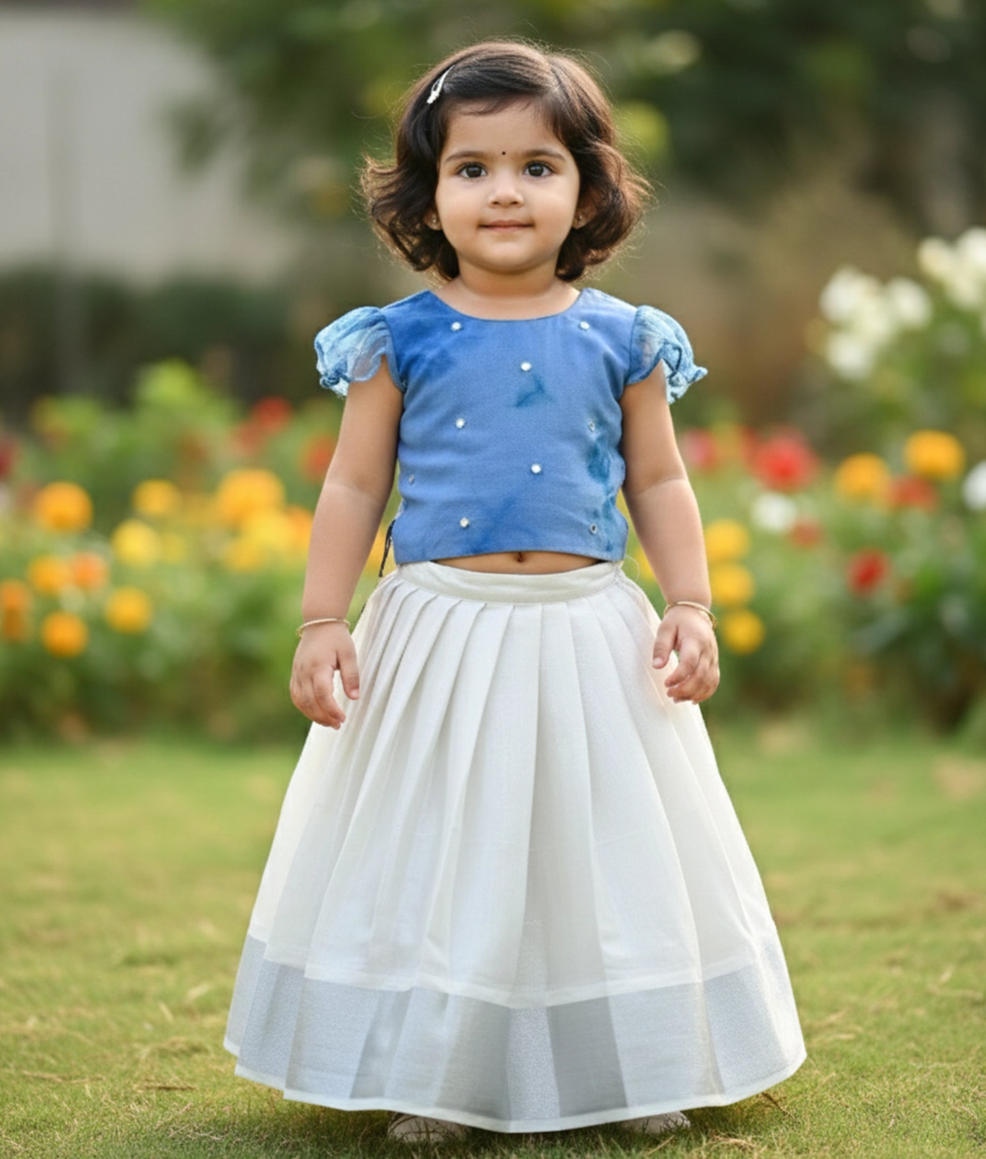 This dress consists of a traditional outfit for a child. The top blue organza with kasav Full skirt. The top has a round neck with short Puff sleeves.it has small mirrors on the bodice. The skirt is pleated with a silver border on the hem. It's perfect for festivals, weddings, or special occasions.