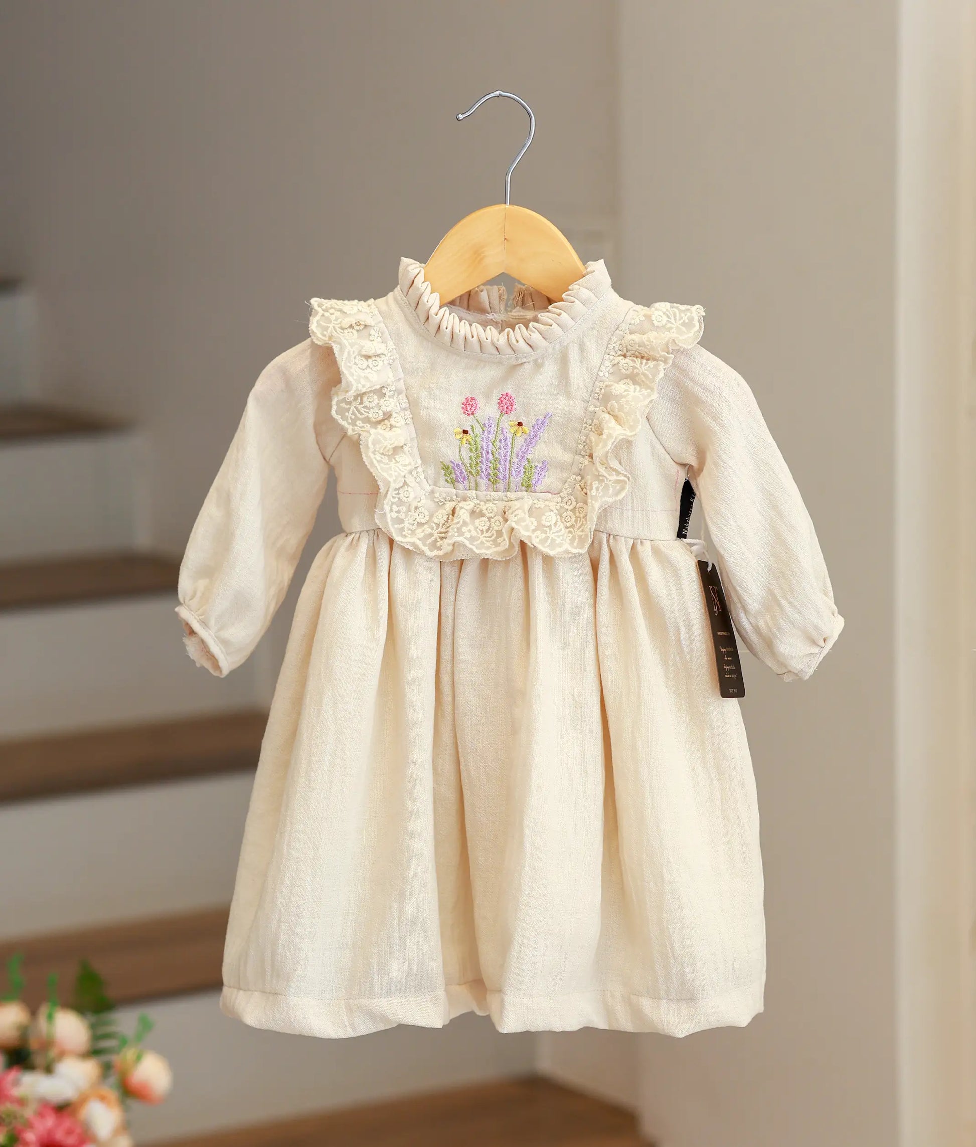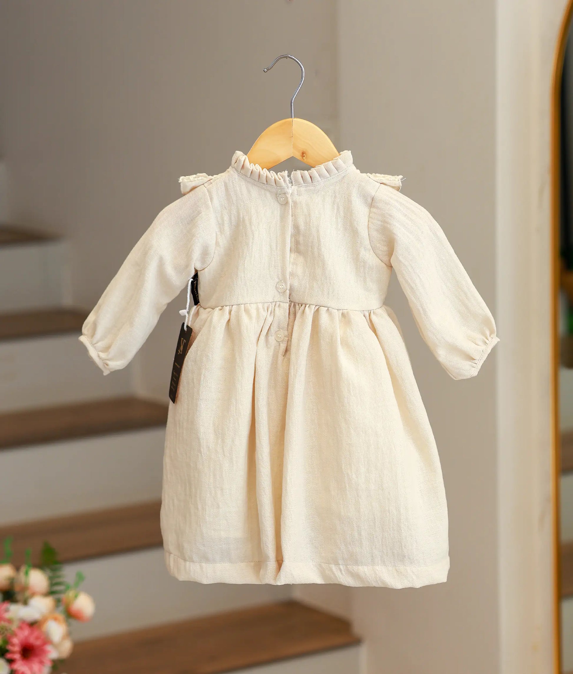 Cream Floral Embroidered Linen Frock For Baby Girl [Ready To Ship: 5613]
