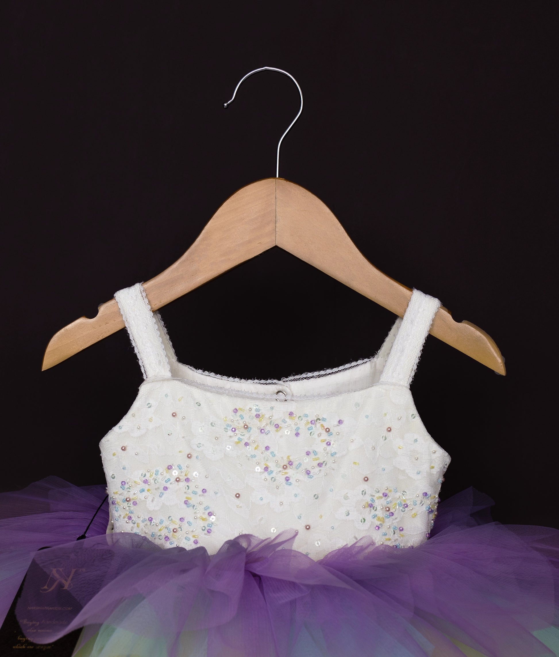 This is a beautiful multicolor frock for a girl. perfect for a young girl's special occasion such as a birthday, pageant, or photoshoot.it has a square neck with Shoulder strap. The bodice is made with off white work material like sparkling sequins and small Pearls. The skirt is voluminous, made from layers of tulle. The tulle layers are arranged in pastel shades including lavender, light blue, mint green, soft yellow, peach, and white. The skirt is flared out widely from the waist.