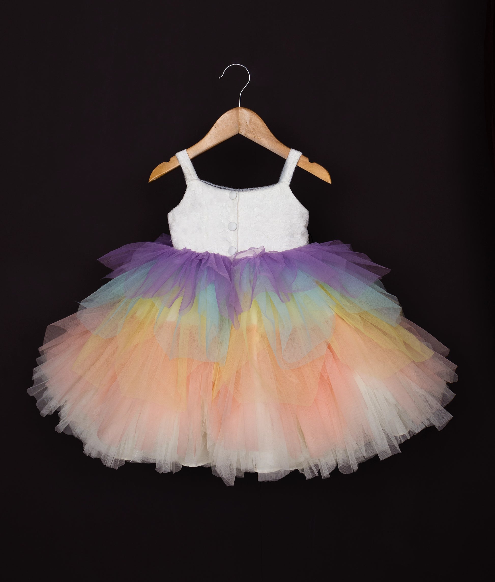 Multicolour Tulle Net Rainbow Theme Birthday Frock For Baby Girl [Pre order:5187]