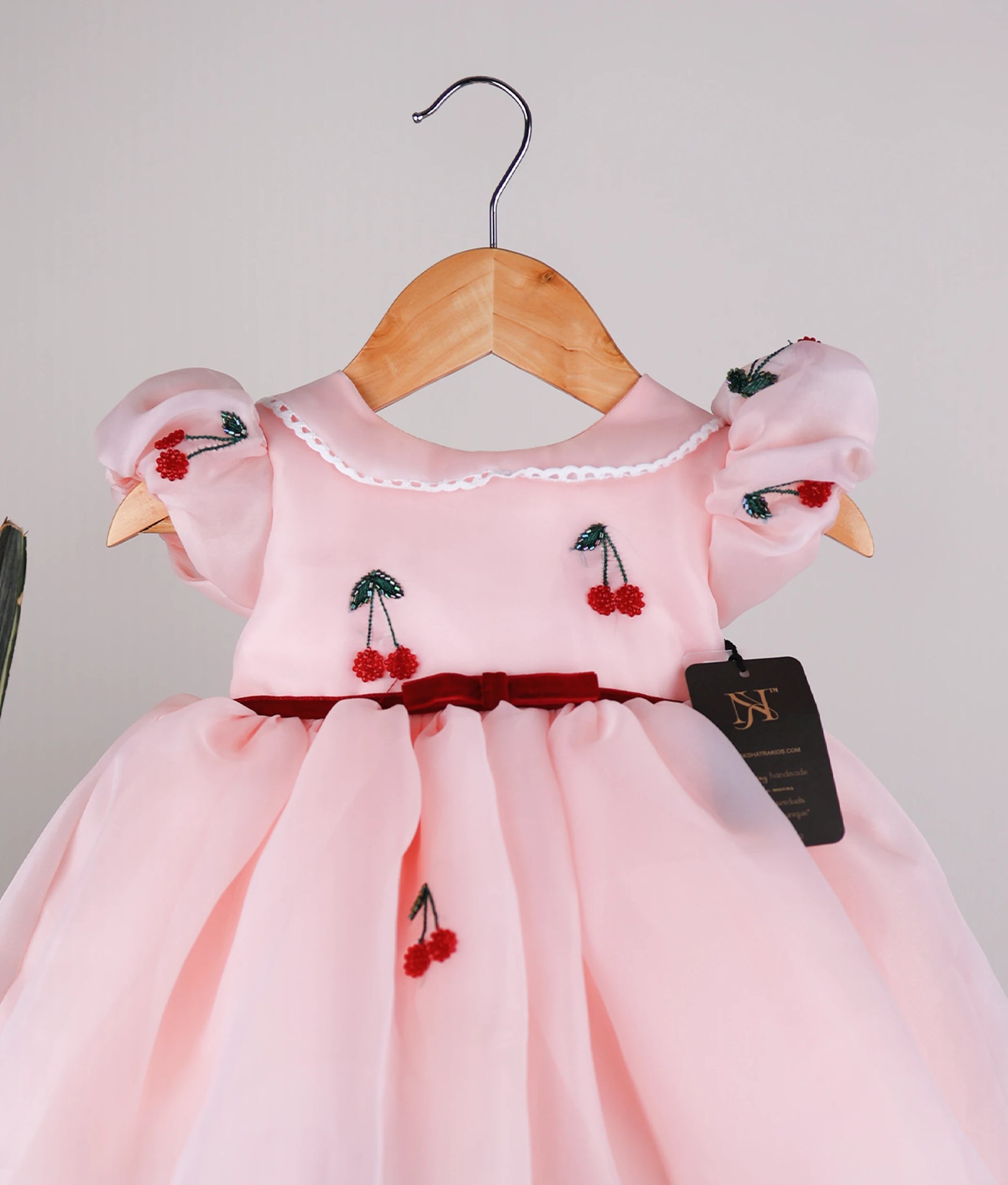 Pastel Peach Plain Organza Cherry Theme Dress For Baby Girl [Ready To Ship : 5257]