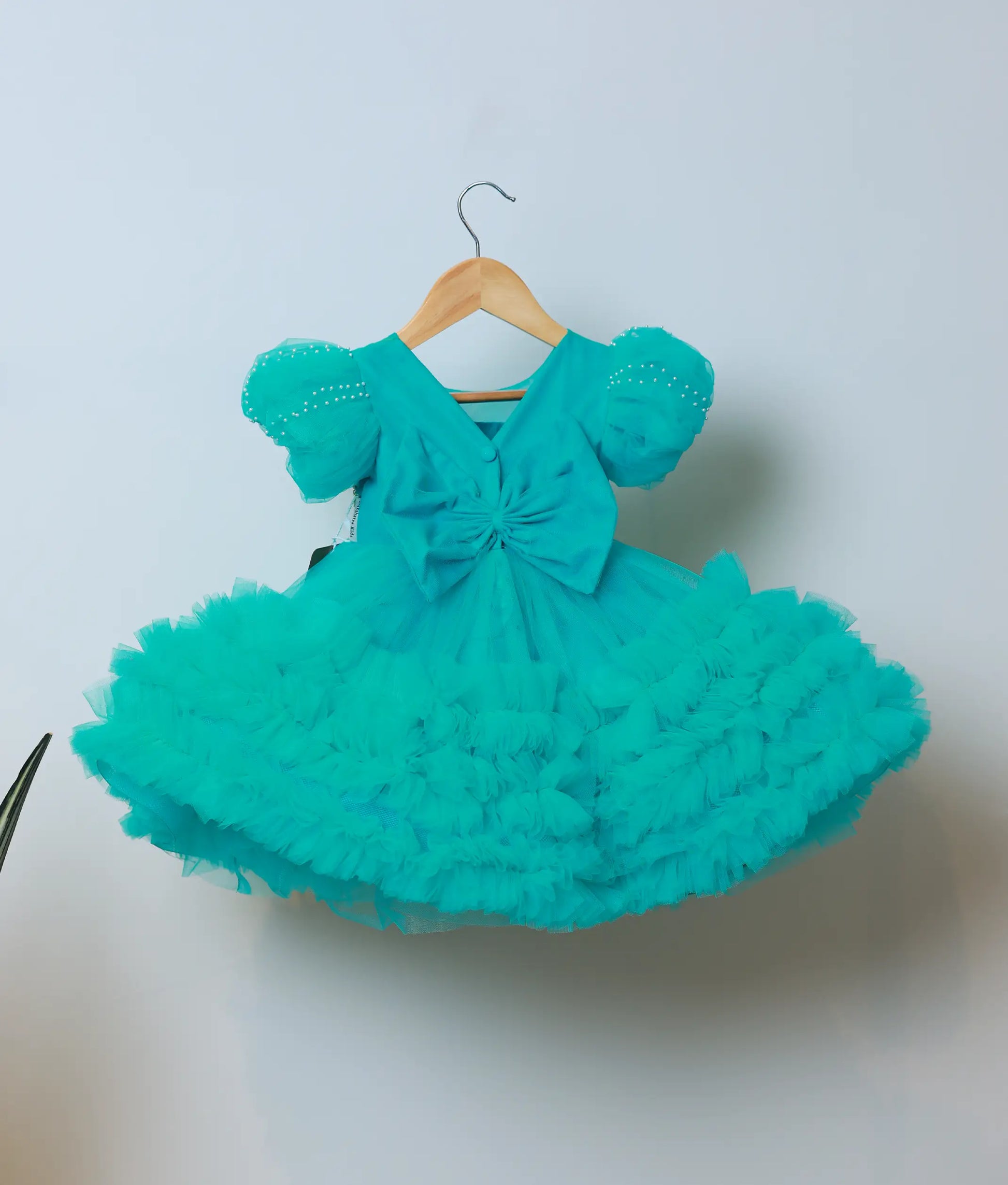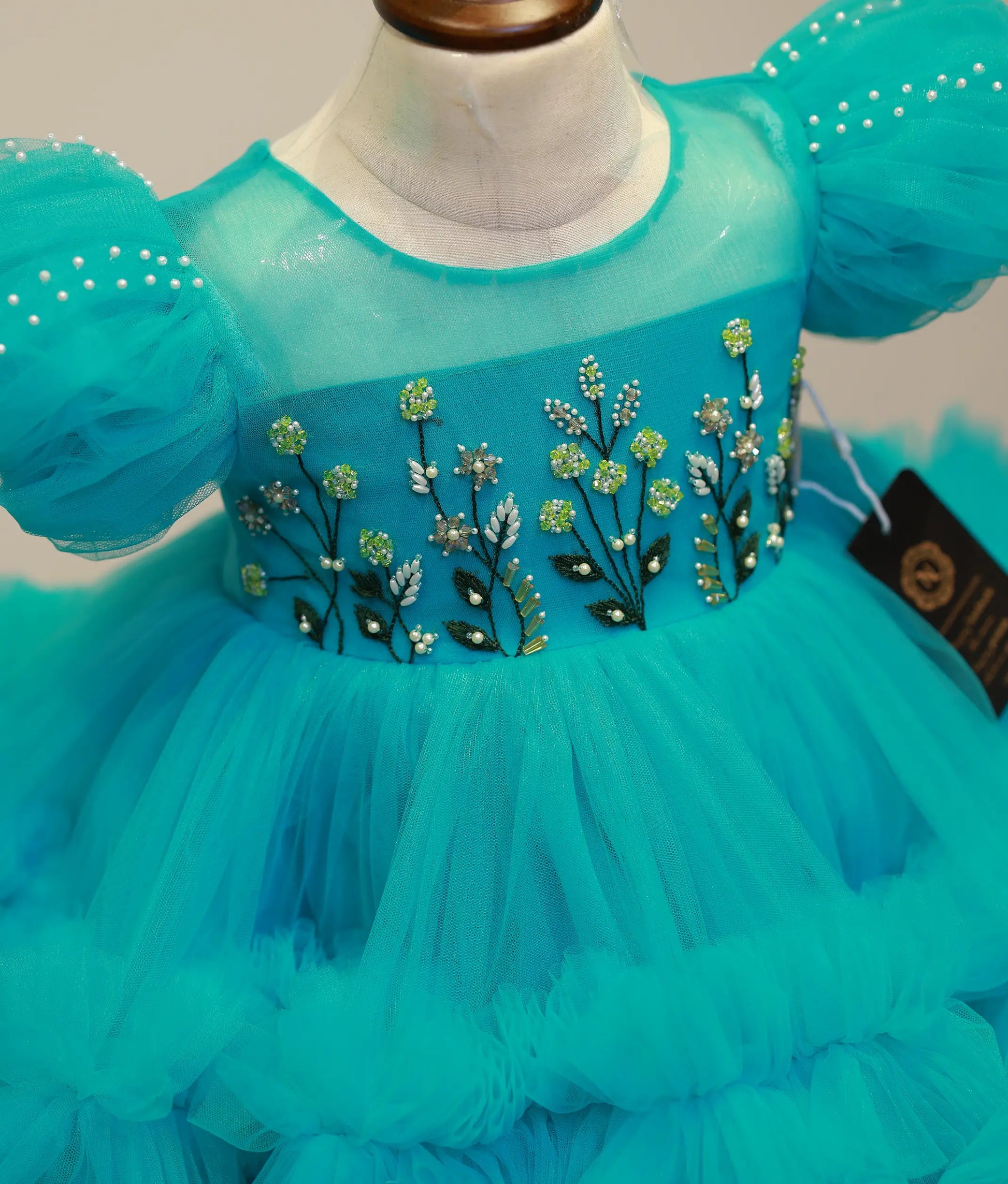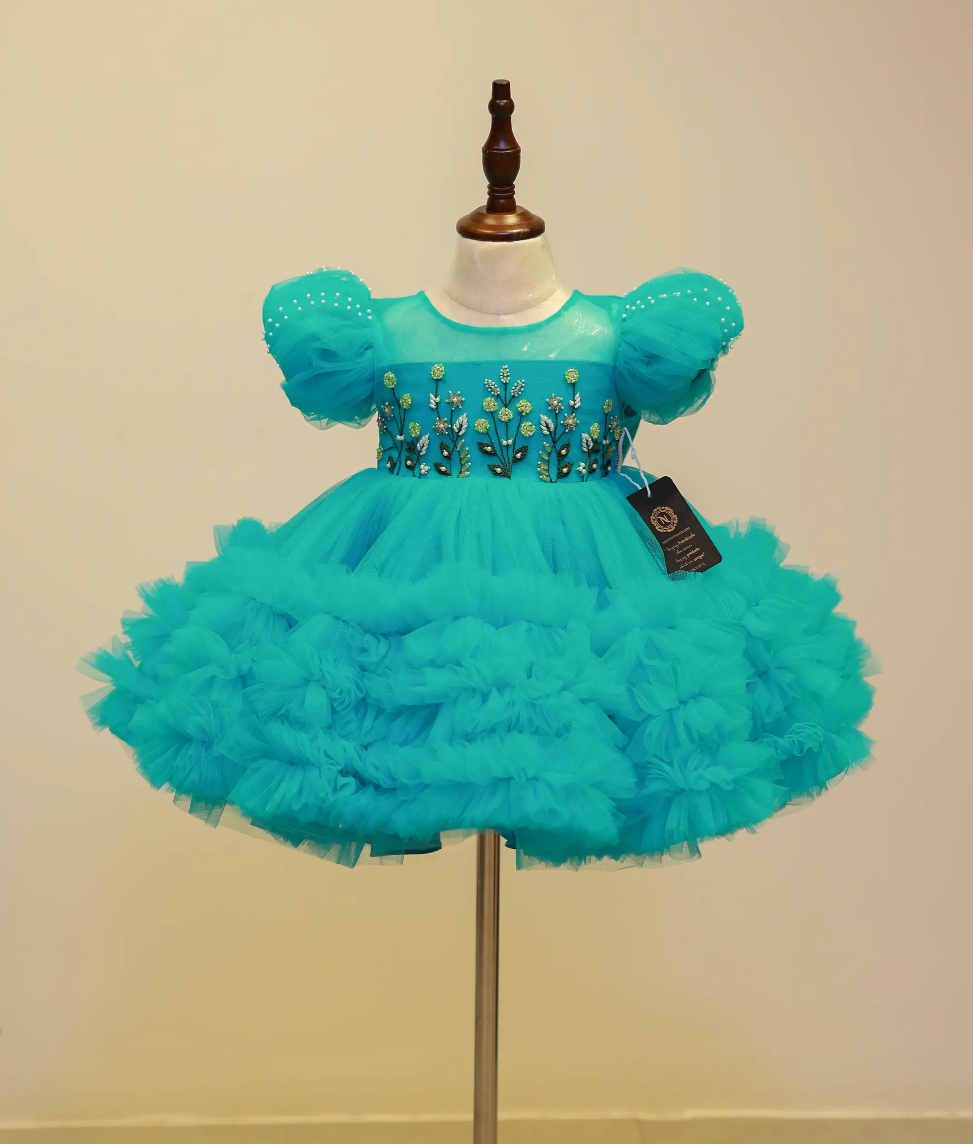 Peacock Blue Tulle Net Handworked Birthday Frock For Baby Girl [Ready To Ship: 5541]